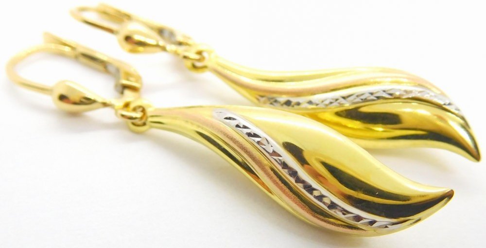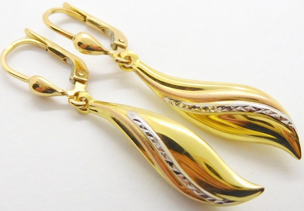 Ryzost zlata: AU 585/1000Materiál šperku: bílé zlato , růžové zlato, žluté zlatoHmotnost šperku: 2,71grHmotnost zlata: 2,71grDrahé kameny: neDruh: zlaté náušnice visacíZapínání: na patentGravírování: anoRozměry: viz. fotoDruh: visací