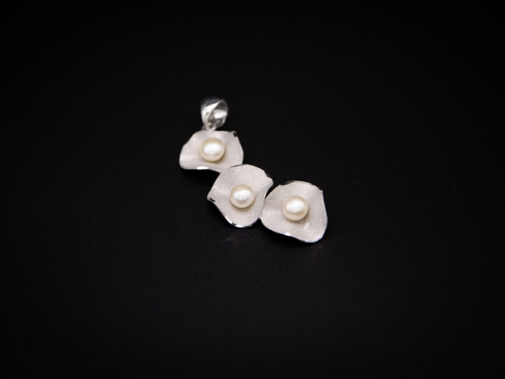 Unikátní přívěsek vyrobený ze stříbra s přírodními perlami ve tvaru okvětních lístků.