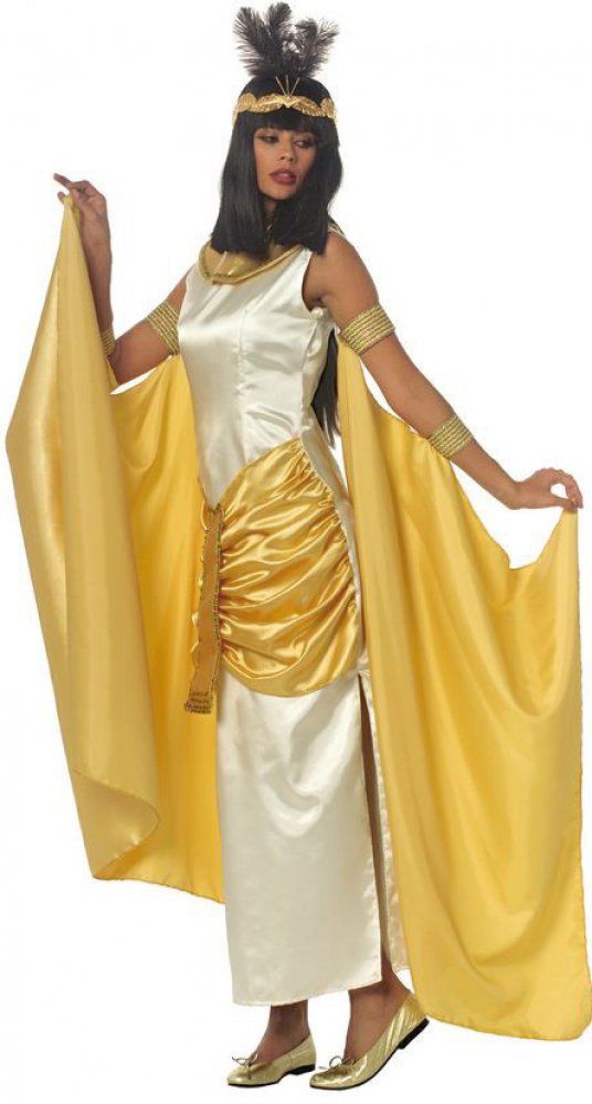 Luxusní kostým - divadelní kvalita. Šaty s závěsy na ruce, zlatý límec. Čelenka není součástí. Rozměry - délka od ramene 150, prsa 96 a pas 90 cm.