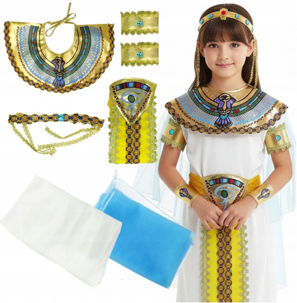 Proměňte své dítě v opravdovou královnu Egypta s tímto jedinečným kostýmem Kleopatry! Sada obsahuje vše, co potřebujete: elegantní šaty, majestátní pláštěnku, zdobený pás, stylový límec, čelenku a dvě na ruce.