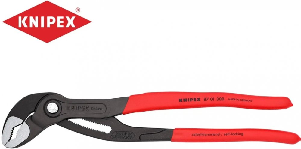 Kleště KNIPEX Cobra 87 01 300 s délkou 300 mm umožňují přesné nastavení díky tlačítkovému mechanismu a spolehlivě drží trubky i matice různých velikostí. Robustní konstrukce splňuje normu DIN ISO 8976 a zajišťuje dlouhou životnost při každodenním pou