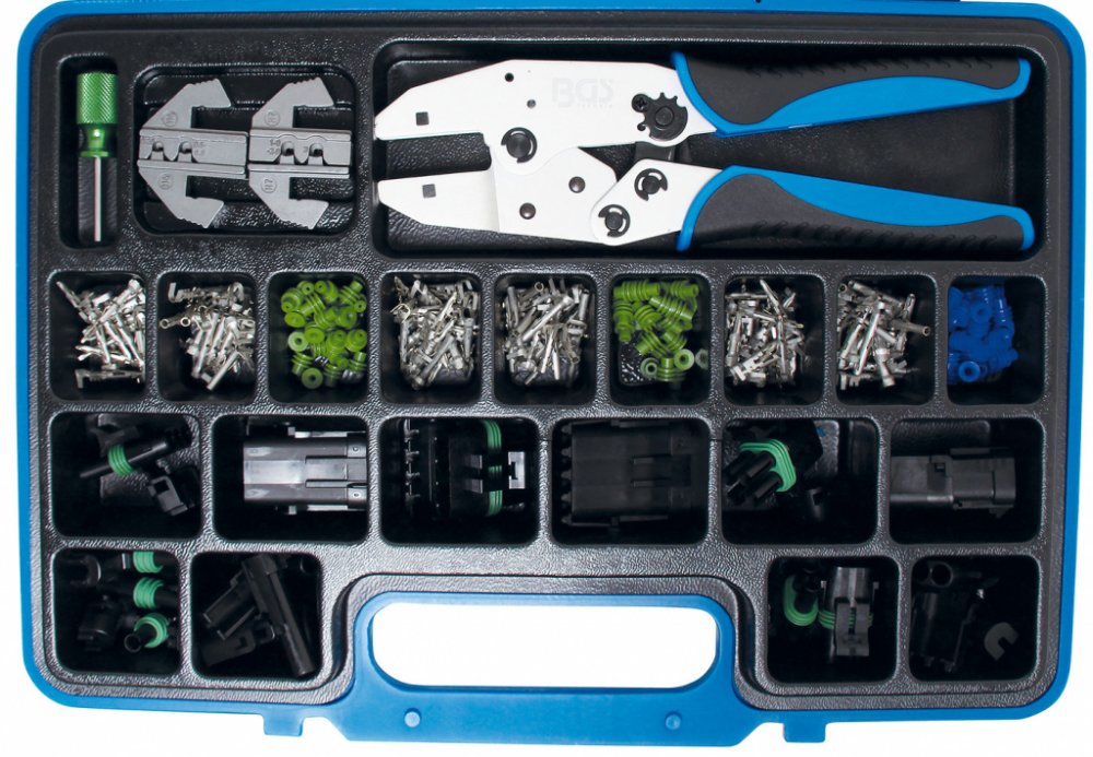 pro opravu stávající kabeláže a pro novou elektroinstalaci zahrnuje následující nástroje: rychlé výměnná ráčnová krimpovačka (z hliníku) H6 pár čelistí pro velikosti drátu: DIN 0,35 / 0,5 - 0,8 mm2 (AWG 22 / 20-18) H7 pár čelistí pro drát velikosti: DIN 1,0 - 2,0 / 3,0 mm2 (AWG 16-14 / 12) nástroj na uvolnění svorek zahrnuje následující části vodotěsného konektoru: 25 x 1,4 mm drátěné těsnění pro drát O 1,4 - 1,9 mm 30 x 2,5 mm drátěné těsnění pro drát O 2,5 - 3,4 mm 25 x 2,8 mm drát těsnění pro drát O 2,9 až 3,8 mm 20 x 0,50 - 0,85 mm2 samčí koncovky 20 x 0,50 - 0,85 mm2 samice koncovky 20 x 1,25 - 2,0 mm2 samčí koncovky 20 x 1,25 - 2,0 mm2 samice 20 x 3 mm2 samice 20 x 3 mm2 samice 3 x 1pólová pouzdra pro zástrčky 3 x 1pólová pouzdra pro zásuvkové svorky 2 x 2pólová pouzdra pro zástrčky 2 x 2pólová pouzdra pro zásuvkové svorky 1 x 3pólová pouzdra (jednořadý typ) pro samčí svorky 1 x 3pólová pouzdra (jednořadá typ) pro zásuvkové svorky 1 x 4pólové pouzdro (jednořadý typ) pro zásuvkové svorky 1 x 4pólové pouzdro (jednořadý typ) pro zásuvkové svorky 1 x 4pólová pouzdra (dvouřadý typ) pro zásuvkové svorky 1 x 4pólová pouzdra (dvouřadý typ) pro zásuvkové svorky Technické informace