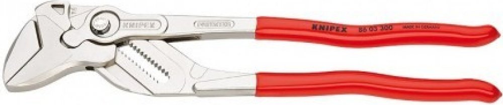 86 03 300 Klešťové klíč Kleště a klíč v jediném nástroji Výborně se hodí k uchopování, držení, stlačování a ohýbání součástí Pro šetrnou montáž povrchově zušlechtěných armatur Žádné poškození hran u choulostivých armatur díky celoplošné opoře bez vůle Rychlé nastavení stisknutím knoflíku přímo na sevřené součásti Žádné neúmyslné přenastavení čelistí a žádné proklouznutí kloubu Nahrazuje kompletní sadu klíčů na šrouby Plynulé nastavení všech velikostí klíčů až do uvedené kapacity pomocí paralelně vedených čelistí Zdvih mezi čelistmi umožňuje rychlé utahování a povolování šroubových spojů na principu rohatky se západkou Velmi silné sevření díky 10násobnému zesílení síly ruky chromvanadová elektroocel, kovaná, kalená v oleji Hlava: Poniklováno Rukojeti: Potaženo plastem Délka: 300 mm Hmotnost: 729 g