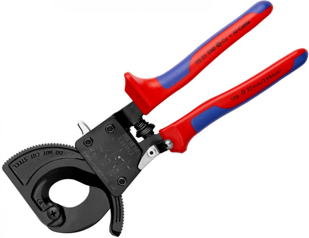 Kleště na kabely ráčnové Knipex 95 31 250 Nůžky na střihání měděných a hliníkových kabelů, jednožilových a vícežilových. nevhodné pro ocelový drát, drátěná lana a jemně splétané (vysoce pružné) vodiče stačí vynaložit malou sílu na střih díky velmi velkému převodu návlek pevného ramene s ploškou pro opření při stříhání obsluha jednou rukou díky principu rohatky se západkou (ráčnovému principu) hlad...