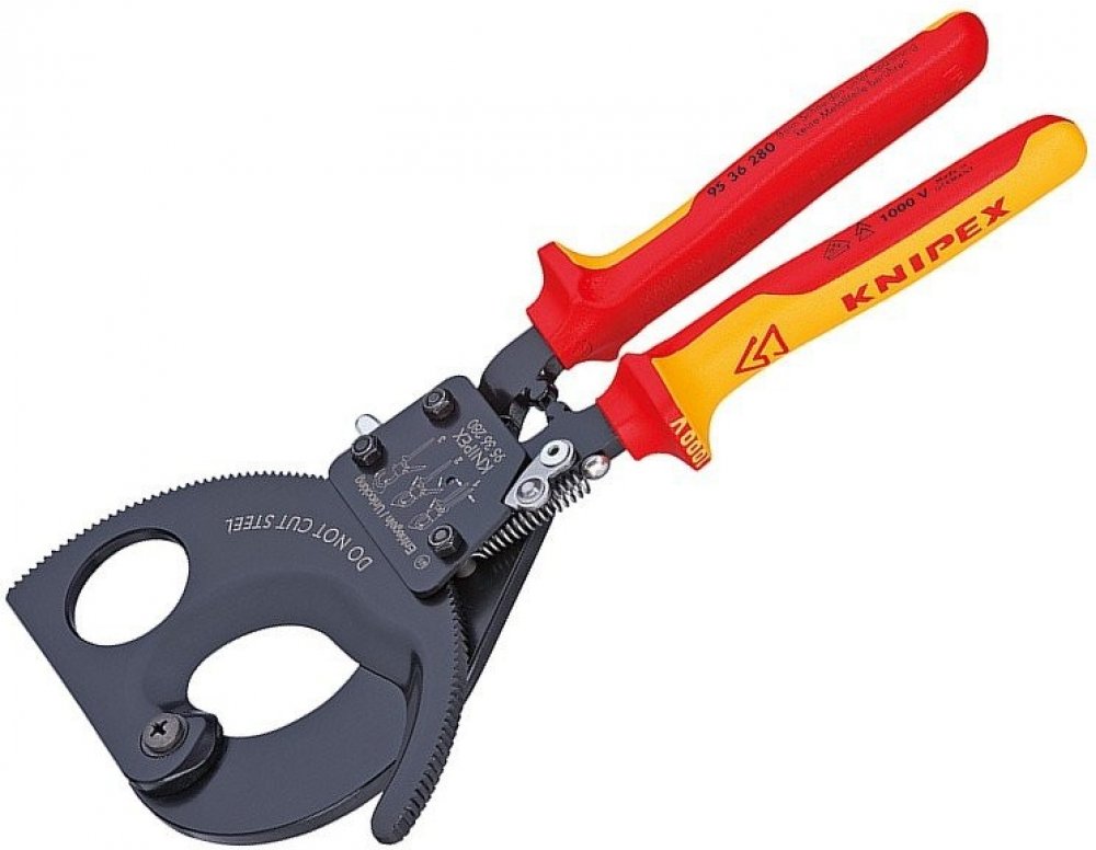 Kleště na kabely ráčnové VDE Knipex 95 36 280 ke střihání měděných a hliníkových kabelů, jednožilových i vícežilových pro stříhání hlínikových sektorových kabelů 4x150 mm² nejsou vhodné pro ocelový drát a drátěná lana černě lakované nářadí, rukojeti izolované vícesložkovými návleky certifikace VDE, použitelné do 1000 V kalené břity s precizním výbrusem princip rohatky se západkou, šroubovaný kloub jednoduchá manipulace díky nízké hmotnosti a kompaktní konstrukci – použití možné i ve stísněných podmínkách kryt chránící prsty uživatele před skřípnutím, otevírací pružina speciální nástrojová ocel ve zvláštní jakosti, kovaná, kalená v oleji
