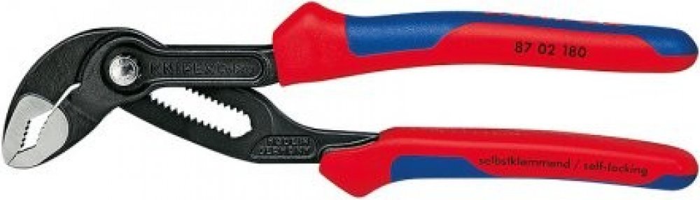 Kleště SIKO KNIPEX Cobra® 300mm nastavení stisknutím tlačítka přímo na obrobku jemné nastavení pro optimální přizpůsobení různým velikostem obrobků a ergonomickou polohu rukojetí samosvorné na trubkách a maticích: žádné sklouzávání na sevřené součásti, práce šetřící síly a vynaložení menší síly plochy čelistí se speciálně kalenými zuby, tvrdost zubů asi 61 HRC: trvale spolehlivé uchopení díky vysoké odolnosti proti opotřebení posuvný průchozí čep kloubu: vysoká stabilita díky dvojitému vedení spolehlivé zaskočení čepu kloubu: žádné neúmyslné přenastavení kryt chránící prsty uživatele před skřípnutím chromvanadová elektroocel, kovaná, kalená v oleji