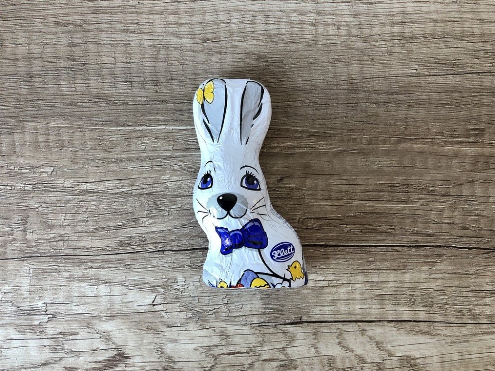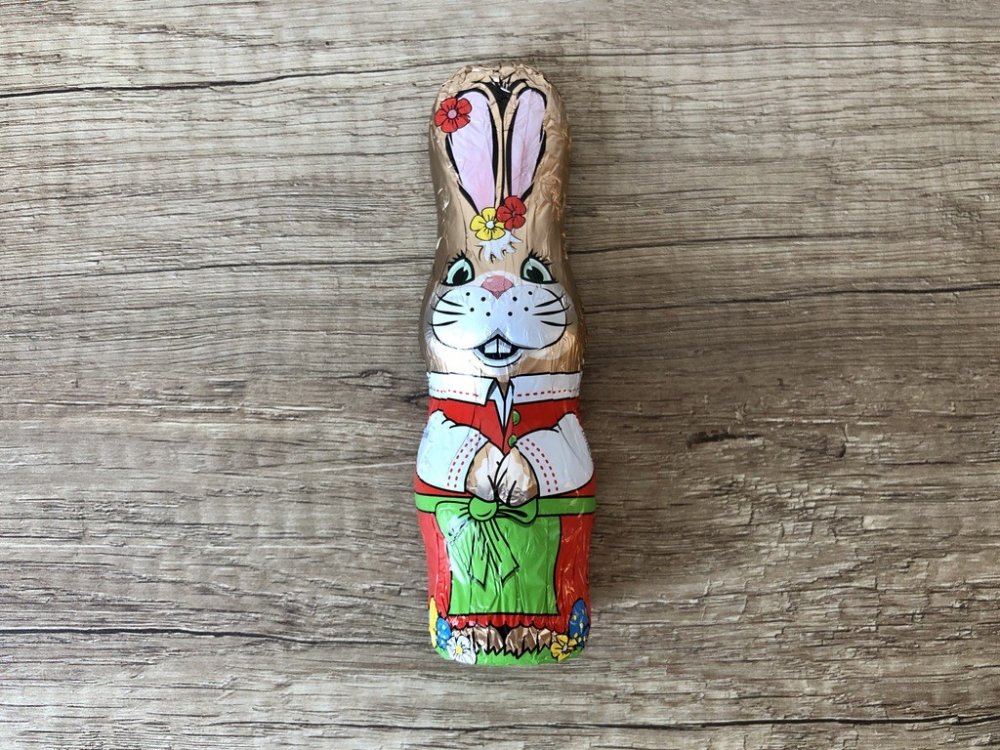 Dutá figurka z mléčné čokolády ve tvaru sedícího zajíčka.