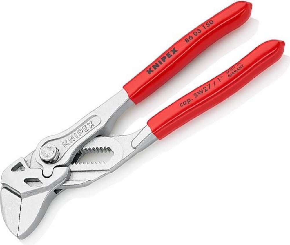 Klíč klešťový Knipex 86 03 Klešťové klíče - kleště a klíč v jediném nástroji, DIN ISO 5743. Niklované kleště, rukojeti potažené umělou hmotou. nastavitelný nástroj pro utahování šroubů výborně se hodí k uchopování, držení, stlačování a ohýbání obrobků nahrazuje sadu klíčů na šrouby, metrické i palcové hladké čelisti pro šetrnou montáž povrchově zušlechtěných armatur žádné poškození hran u choulost...