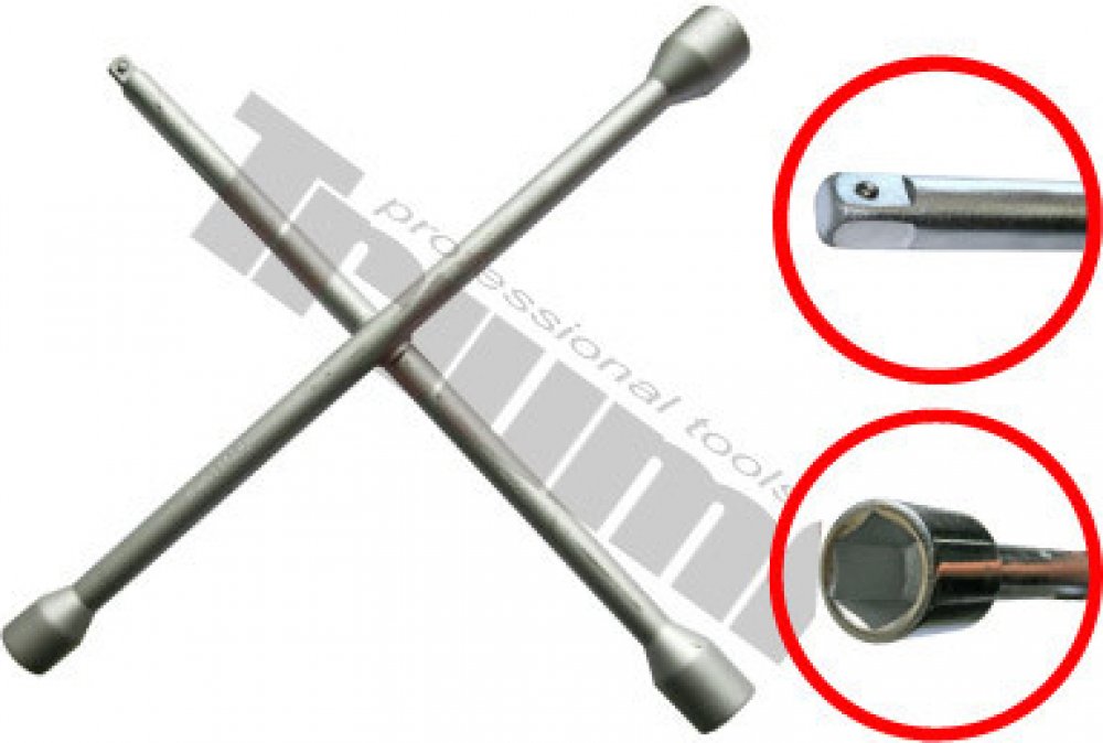 Povrchová úprava: matný chrom. Délka ramene 400 mm. Pro matice kol 17 -19 - 21 mm, + 1/2" čtyřhran (libovolný nástavec s 1/2" vstupem).Tento klíč lze zakoupit jako náhradu za p.k. 18270.