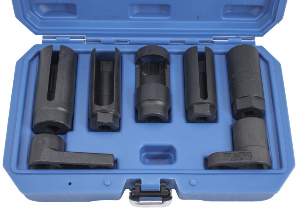Sada klíčů na montáž / demontáž lambda sondy, senzorů, snímačů a naftových vstřikovačů 7ks. Sada obsahuje klíče pro: senzor 29 mm, podtlakový spínač 7/8", vstřiky 27 mm, tlakový olejový spínač 1 1/16", lamda sondu 22 mm, lamda sondu 7/8" a zapuštěnou lamda sondu 7/8" Sada obsahuje: 1-1/16” čtvercový otvor 3/8” L= 74mm 22mm (7/8”) čtvercový otvor 3/8” L=74mm 22mm (7/8”) čtvercový otvor 3/8” L=90mm výřez 20mm 27mm čtvercový otvor 1/2" L=85mm 29mm čtvercový otvor 1/2” L=90mm 22mm (7/8”) vícehranný otvor 1/2” 22mm (7/8”) čtvercový otvor 3/8”