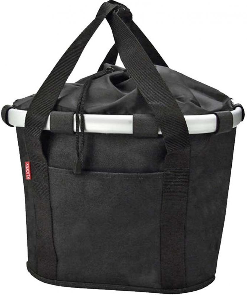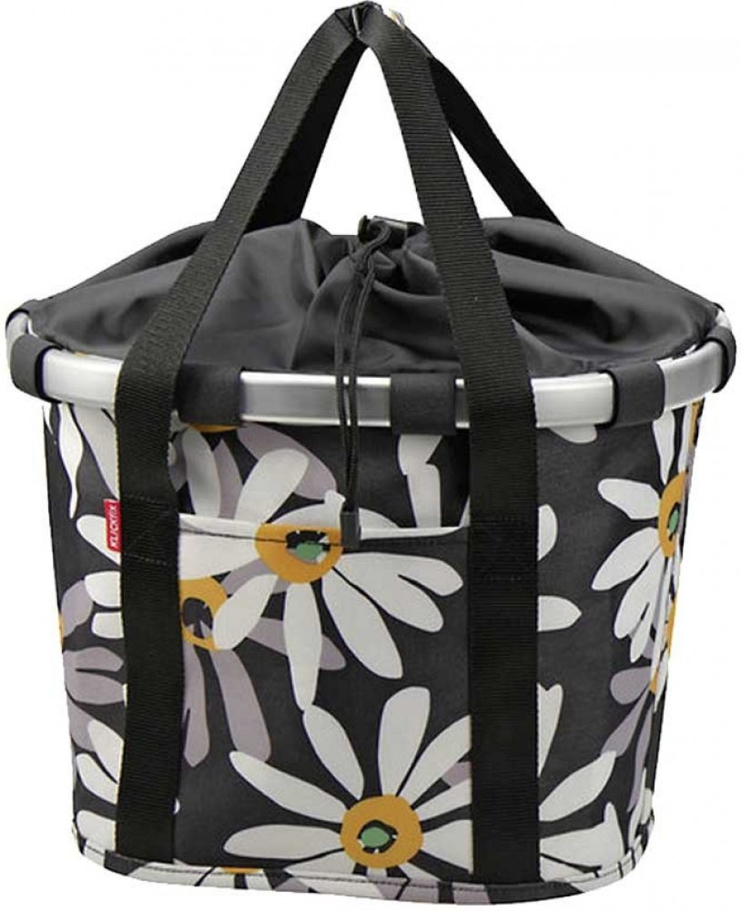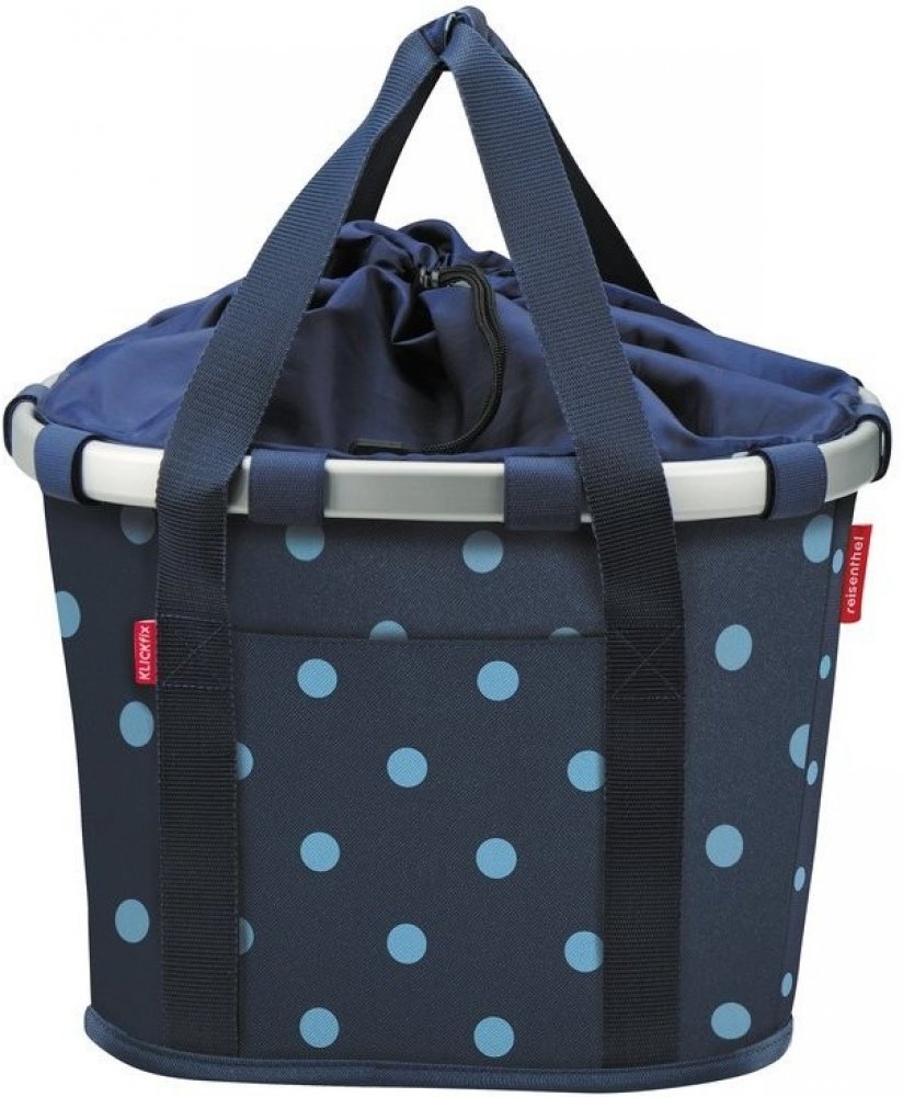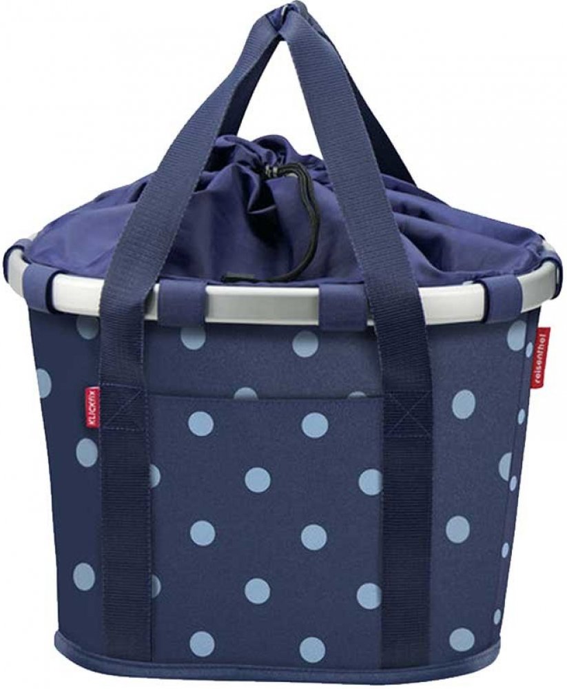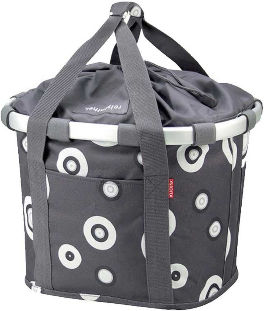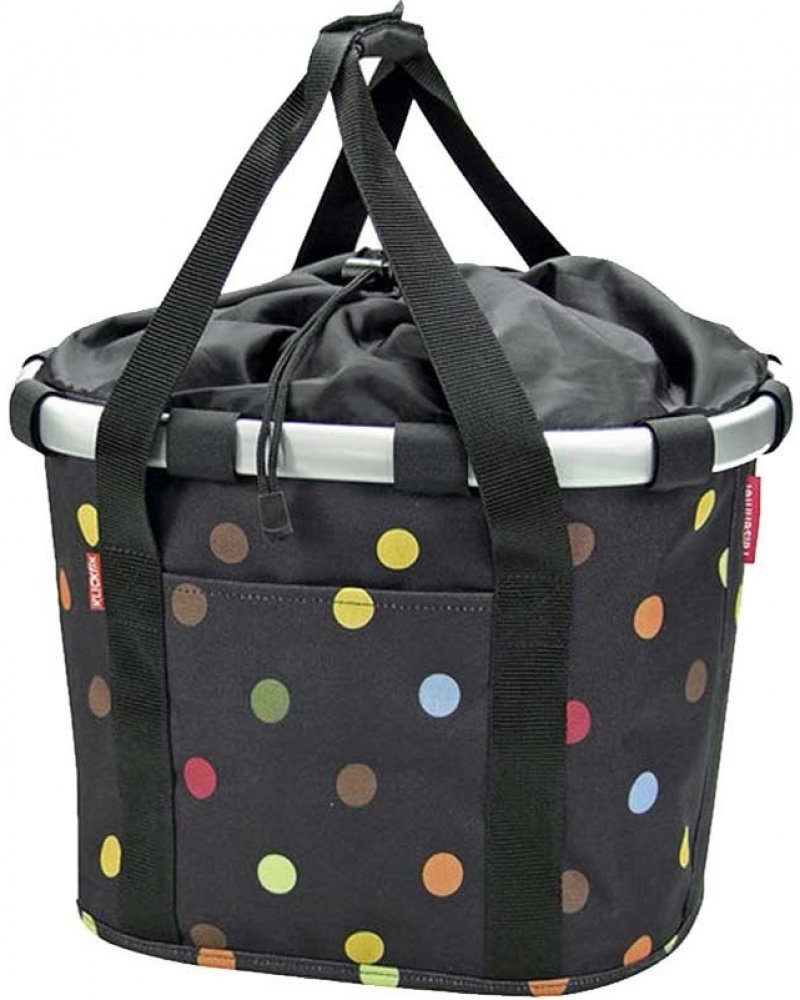Černá cyklistická taška, jejíž design je osvěžený bílými tečkami, je velmi elegantnía zároveň praktická. Pomocí systému Klickfix jí můžete jednoduše připevnit na své kolo, ale také ji můžete používat jako běžnou nákupní tašku. Základem je hliníkový rám, díky kterému je dostatečně pevná. Na adaptér Klickfix se připevní jednoduchým kliknutím a stlačením červeného tlačítka ji můžete stejně lehce odebrat.