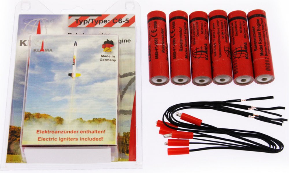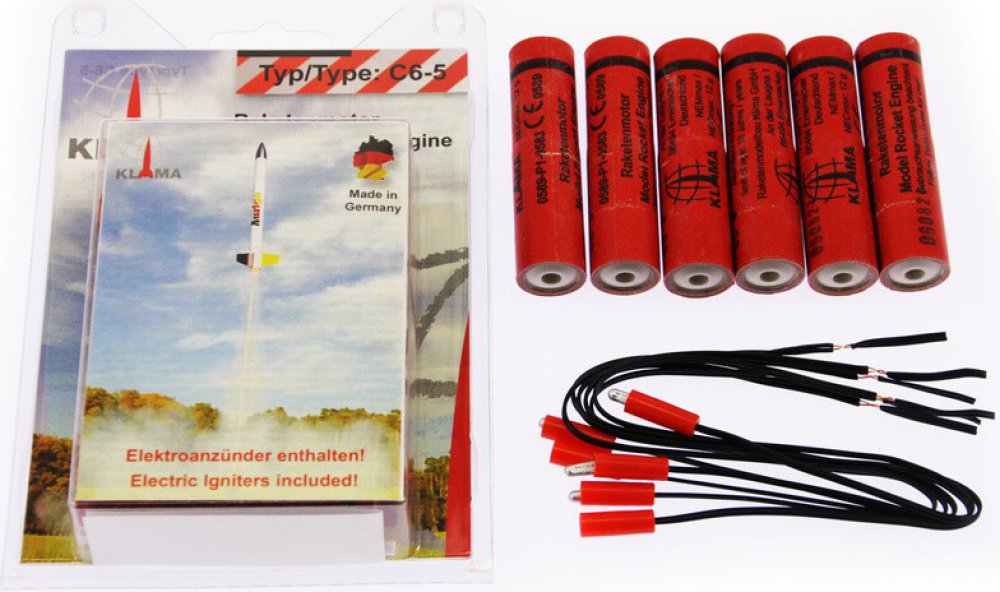 Raketový motor Klima C6-5 pro modely raket. Rozměr raketového motorku ø18 x 70 mm, impuls 10 N·s, průměrný tah E2 N, doba hoření 1.6 s, zpoždění výmetu 5 s. Hmotnost motorku 21.2 g, hmotnost náplně 10.2 g. Maximální doporučená hmotnost modelu rakety je 150 g.