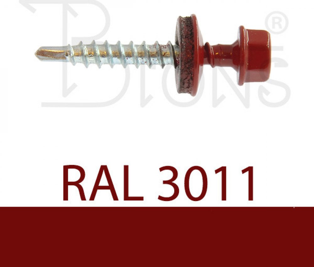 Samovrtný farmářský šroub do dřeva s gumovou těsnící podložkou EPDM, materiál pozinkovaná ocel, lakovaný v barvě RAL 3011 (vínově červená).