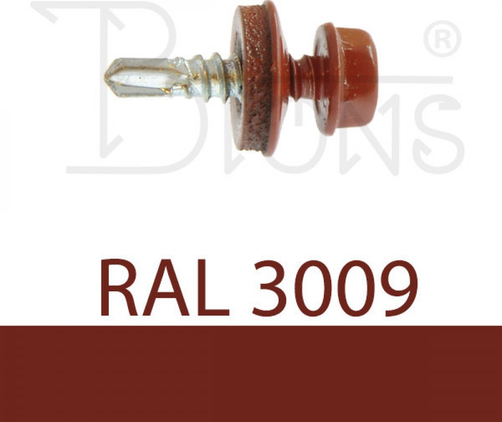 Samovrtný šroub do kovu s gumovou těsnící podložkou EPDM, materiál pozinkovaná ocel, lakovaný v barvě RAL 3009 (červenohnědá).