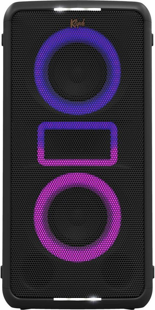 Výkonný zvuk pro párty, Dynamické RGB osvětlení s šesti módy a barvami, 18 hodin přehrávání bez světelných efektů a až 10 hodin s aktivními světly, Bluetooth 5.2, Karaoke, Integrovaná kolečka rukojeť pro snadnou přepravu, Aplikace Klipsch Connect Plus, Stupeň krytí IPX4