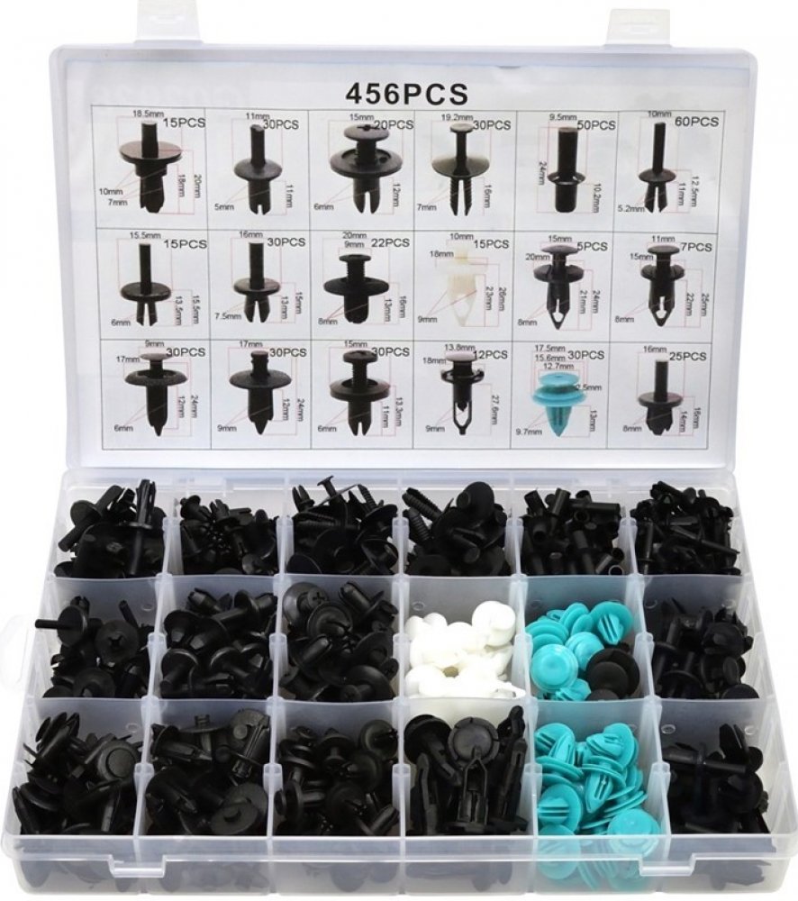 Univerzální sada obsahující 456 dílů je navržena pro použití u většiny nejpopulárnějších značek automobilů. Díky širokému spektru spon a úchytů je ideální pro různé opravy a montážní práce.