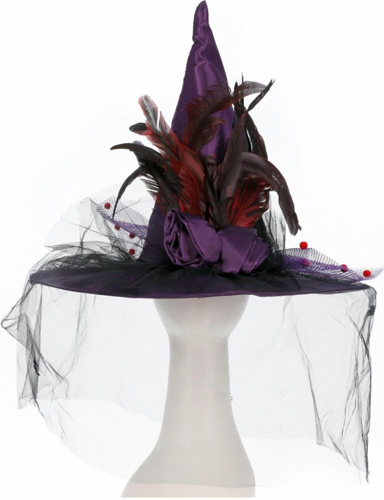 Klíčové vlastnosti doplňku ke kostýmu Smiffys Čarodějnický klobouk s peřím a závojem, fialovýČarodějnický kloboukVhodný na karneval a HalloweenSoučástí klobouku je peří a síťovinaZdobený pavoučkyMateriál je polyester
