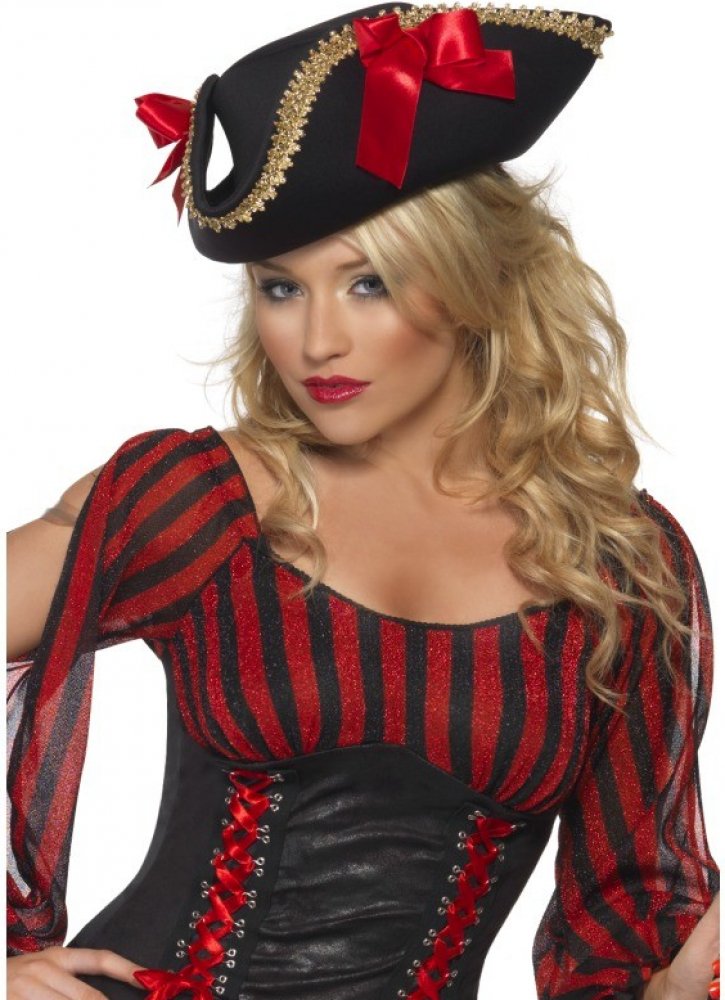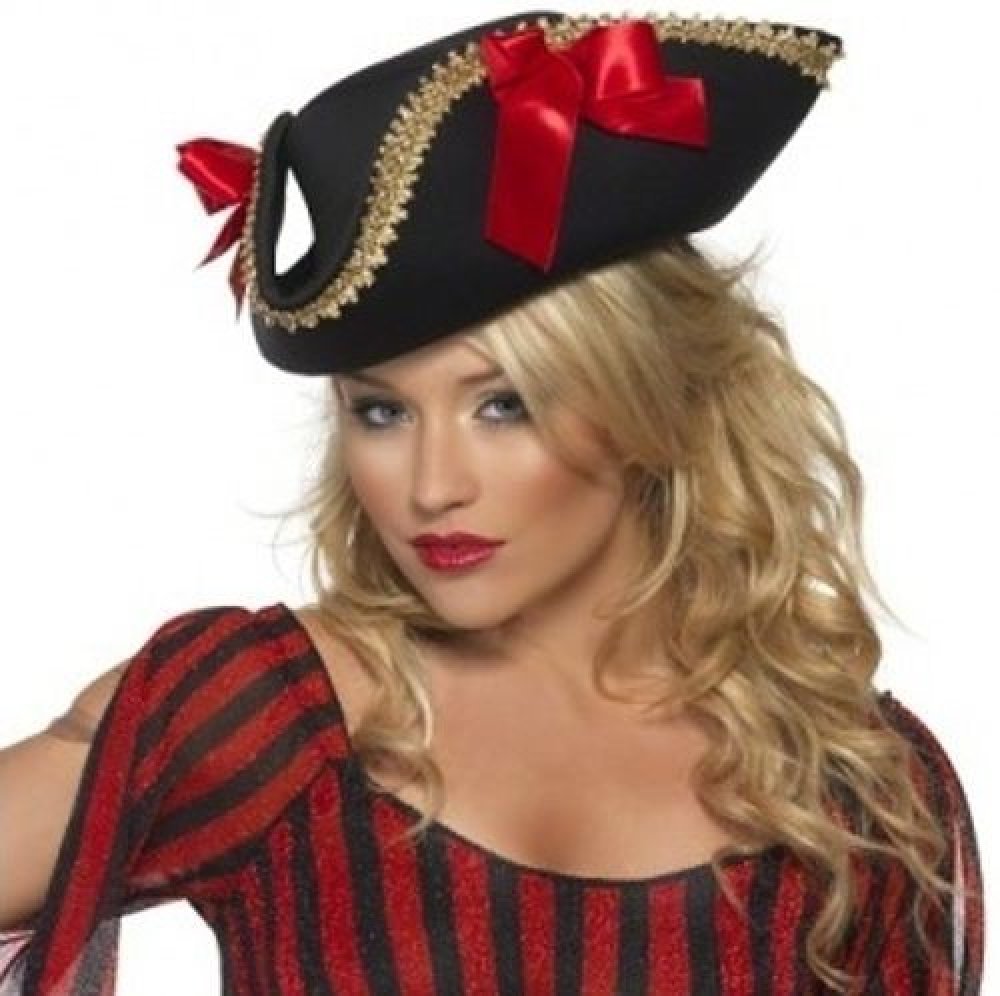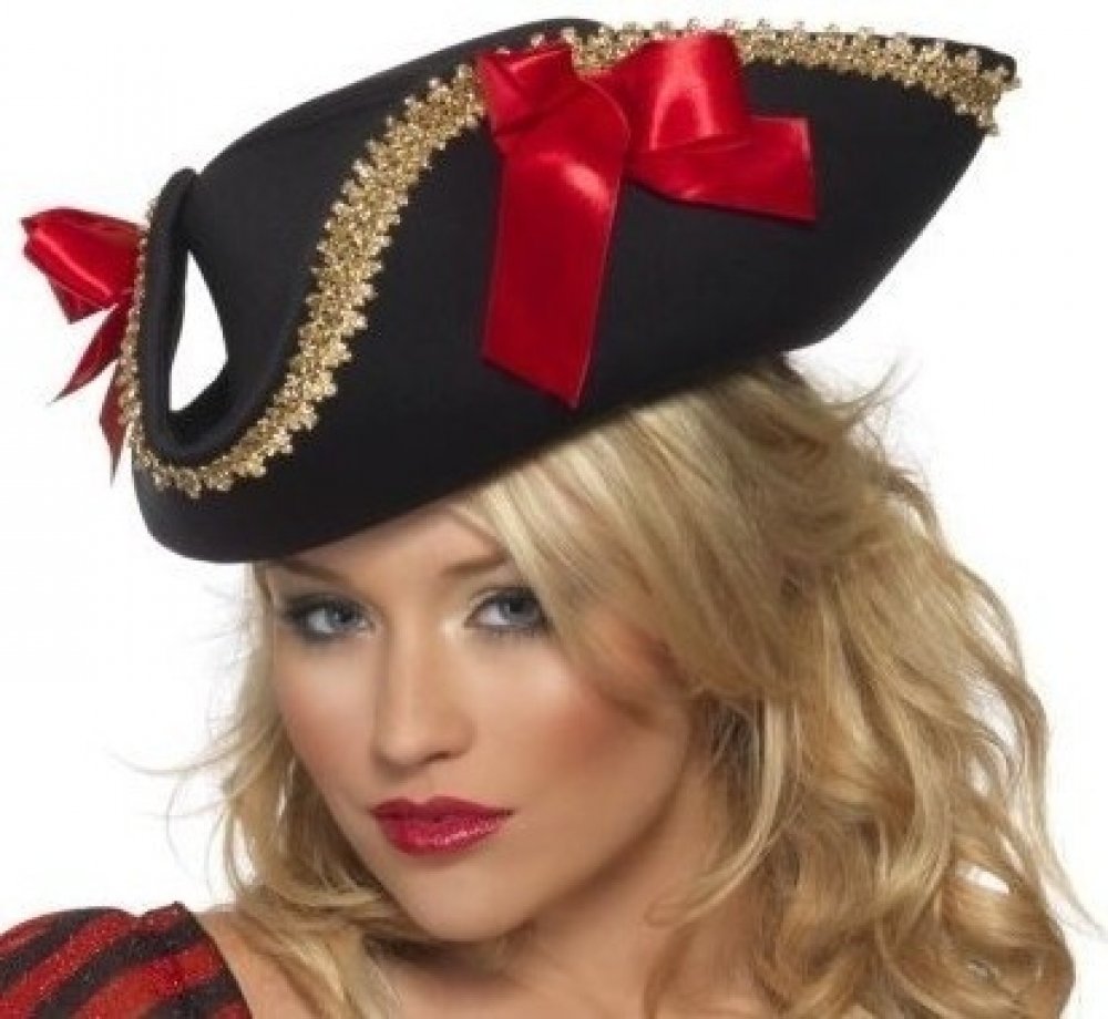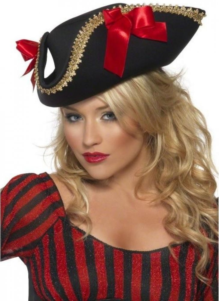 Trojhranný černý klobouk pro dámy se zlatým lemováním a červenými mašlemi. Krásný doplněk Vašeho pirátského kostýmu.