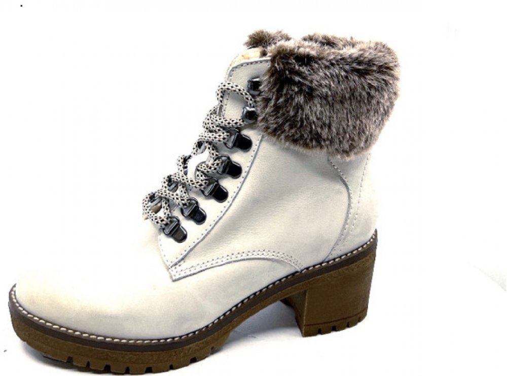 kožené kotníkové boty na pohodlném vyšším podpatku s platformou a nesmekavou podrážkou, zateplené vlnou, jednoduché obouvání pomocí zipu, velikost odpovídá, šíři lze regulovat tkaničkami, barva smetanová