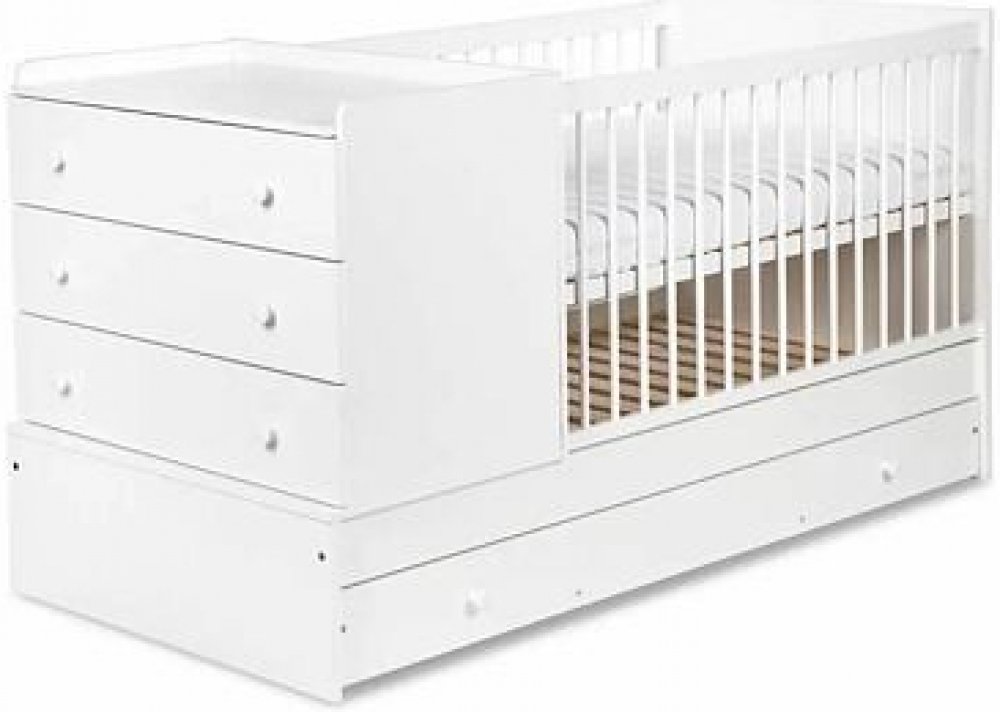 Dětská postýlka Klupš Kompakt z borovice s praktickou komodou, kterou lze využívat jako přebalovací pult.