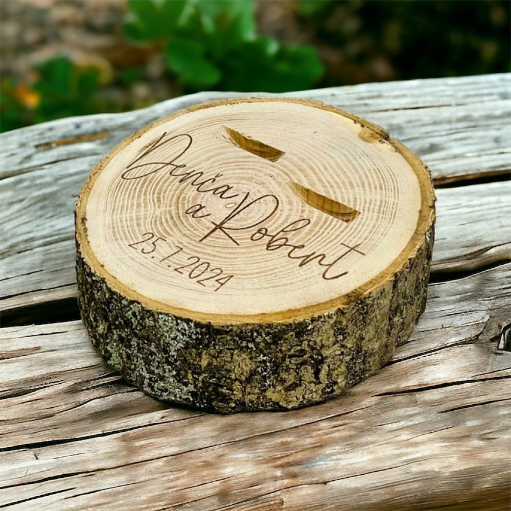 Špalík dřeva (kmen s kůrou) jako držák či podložka na svatební prstýnky. Dolaďte vaši svatbu k dokonalosti tímto posledním detailem. Nechte malou družičku, ať vám přinese prstýnky na tomto přírodním kmínku a vytvořte si krásnou památku.