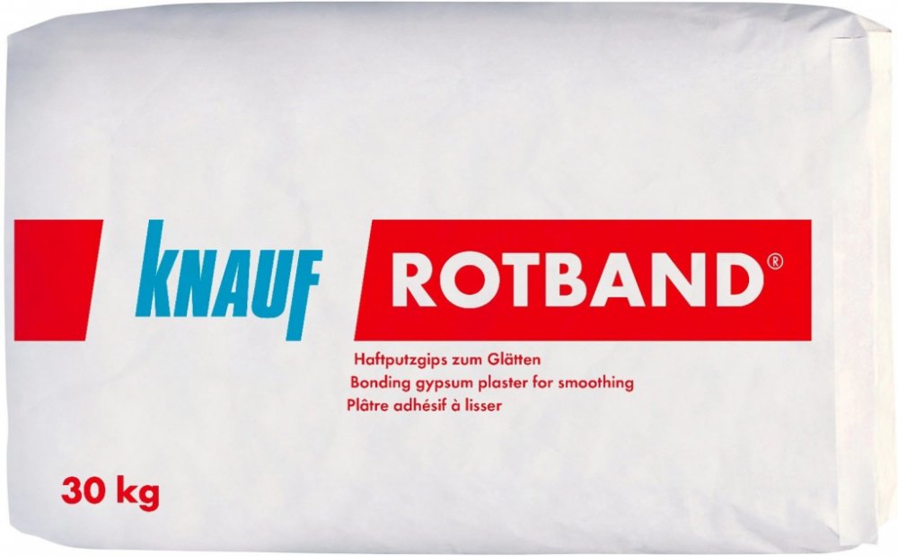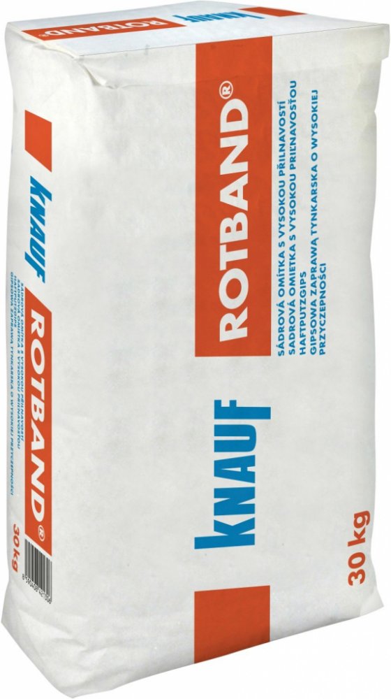 Sádrová omítka s vysokou přilnavostí Knauf ROTBAND Knauf ROTBAND je suchá maltová směs složená z anorganických pojiv, plniv, hygienicky nezávadných chemických zušlechťujících přísad. Knauf ROTBAND vnitřní omítka pro stěny a stropy s velkou schopností adheze - přilnavosti k podkladu. Umožňuje vytvoření jednovrstvé omítky v tloušťce od 5 do 50 mm na stěnách a od 5 do 15 mm na stropech, je vhodná do všech vnitřních místností včetně domácích kuchyní, koupelen a sociálních zařízení (a dále např. WC ve školách, koupelnách v hotelích, nemocnicích, pečovatelských domech), kde trvale vzdušná vlhkost nepřekračuje 70 %. Je vhodná pro ruční nanesení na cihelné zdivo, pórobeton, beton, vyzrálé vápenocementové, cementové a sádrové omítky, sádrokartonové desky a hrubé omítkové podklady. Je vydatná, lehká pro zpracování a umožňuje vytvořit ideálně vyhlazený povrch s výbornou paropropustností. Podrobnější informace naleznete v technickém listu k dispozici ke stažení v sekci ""Datové listy"".