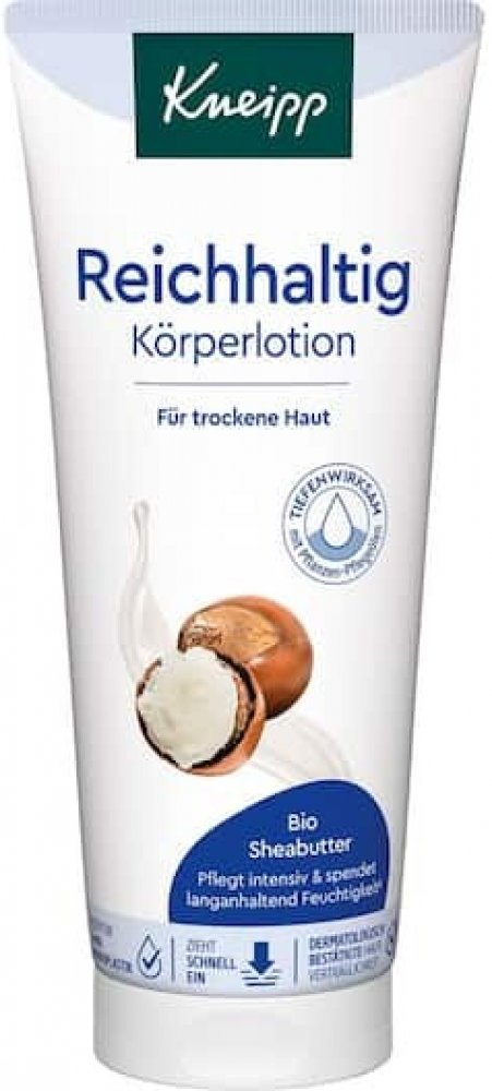 Tělové mléko Rich Body Lotion od Kneippa je speciální tělový přípravek pro péči o suchou pokožku. Vysoce kvalitní olejový komplex z organického bambuckého másla, hroznových jader a mandlového oleje poskytuje revitalizační a zpevňující péči o pokožku. Panthenol hydratuje a je součástí intenzivního pečujícího složení, které zajišťuje větší pružnost a pocit uvolněné pokožky již od prvního použití. Šetrná a nemastná tělová péče od Kneippa pro suchou pokožku Mnoho produktů bohaté péče o pokožku je mastných a pomalu se vstřebává. Tělové mléko je bohaté na cenné složky a vlhkost, což bylo prokázáno vědeckou studií. Rostlinné lipidy jsou velmi podobné lipidům vlastním pokožce, a proto je Bohaté tělové mléko ideální pro velmi citlivou pokožku. Ochranná kožní bariéra je dlouhodobě podporována - a tělové mléko Kneipp nabízí dlouhotrvající hloubkové působení. Tento přípravek péče o pokožku je výrobkem pro každodenní použití. Po očištění pokožky naneste tenkou, bohatou vrstvu tělového mléka a jemně vmasírujte. Tělové mléko neobsahuje škodlivé složky, jako je silikon, parafín a minerální olej. Snášenlivost s pokožkou byla dermatologicky potvrzena. Suchá pokožka potřebuje speciální, hydratační a výživnou péči. S tímto tělovým mlékem se rozhodnete pro rychle se vstřebávající intenzivní péči.