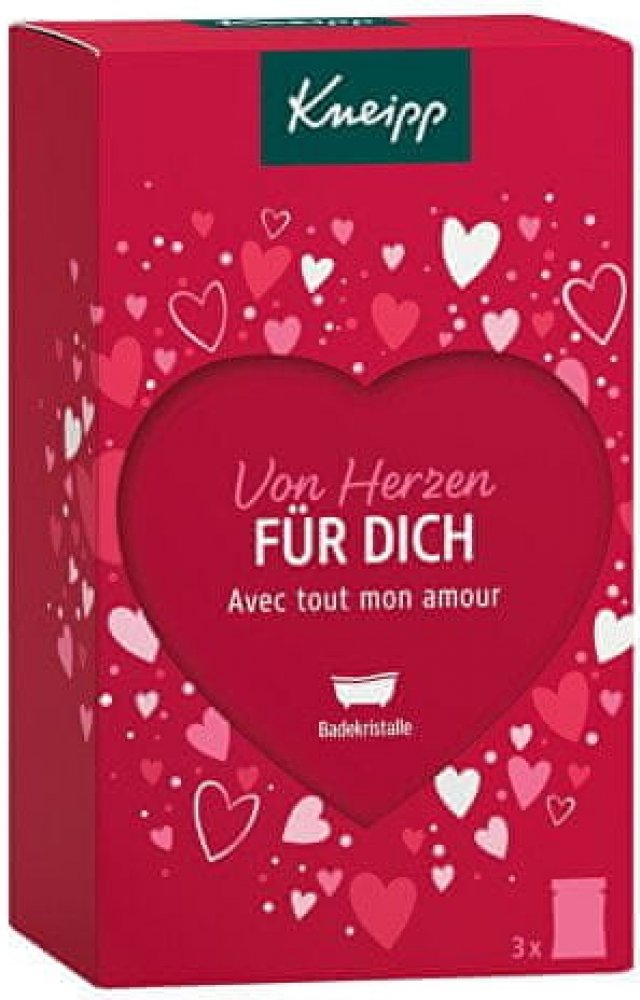 Dárková sada Kneipp Pro Tebe s motivy srdíček a velkým výřezem ve tvaru srdce skrývá 3 koupelové soli s okouzlujícími vůněmi.