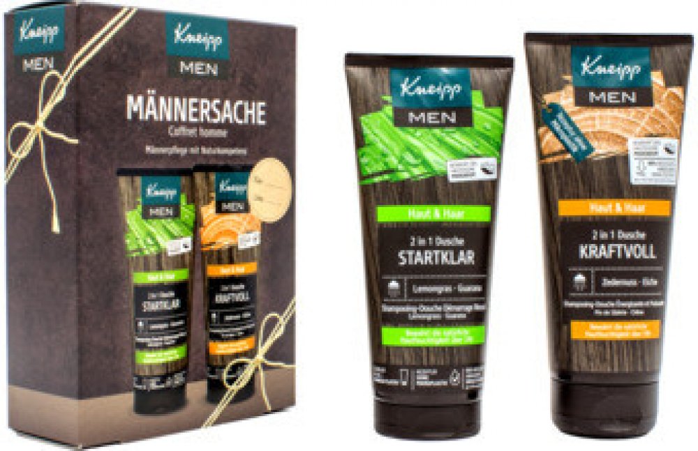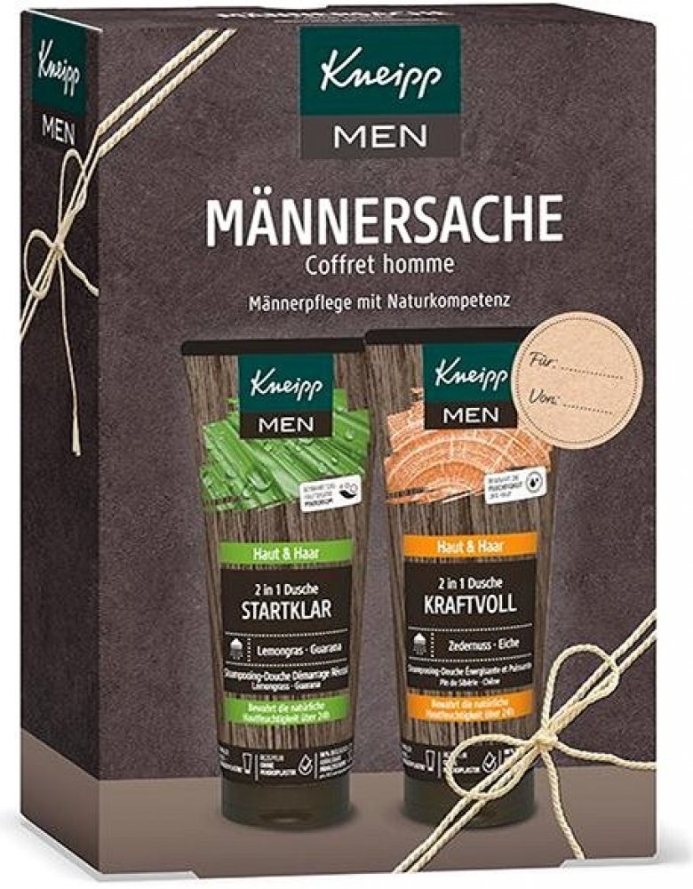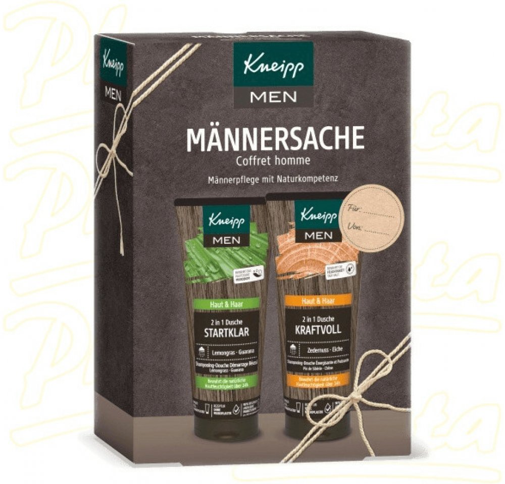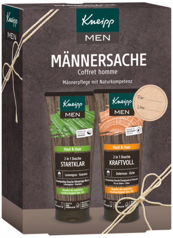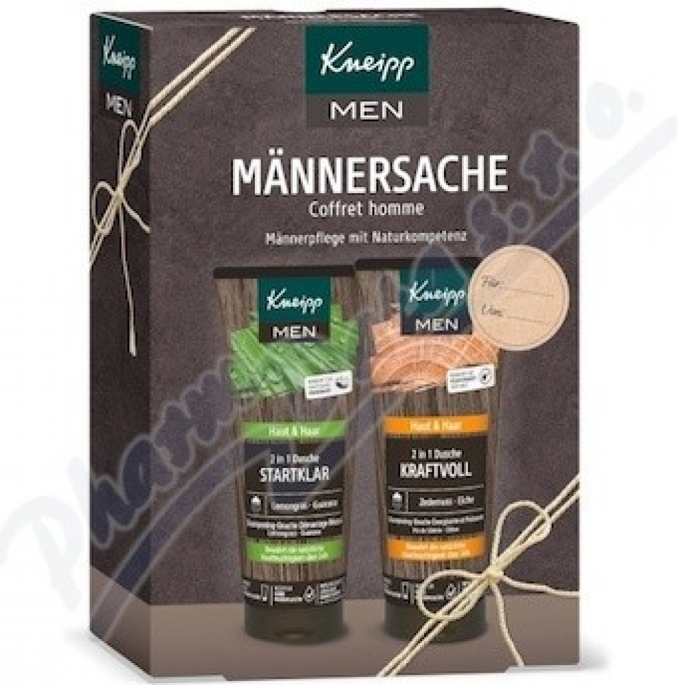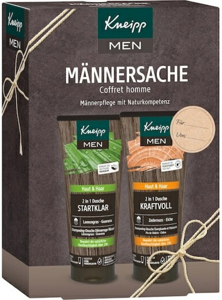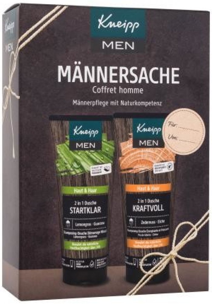 Jedna sprcha může klidně změnit celý den. Správně vybrané přírodní výtažky a oleje umí dodat energii, zlepšit náladu a podpoří odvahu pro náročné úkoly. V Kneipp dárkové sadě najdete 2 pánské sprchové gely 2v1, které fungují na mytí těla i vlasů. Díky obsahu kokosového oleji a panthenolu chrání pokožku i vlasy před vysušováním a zklidňují drobná poranění. Sprcha se sprchovým gelem Ranní budíček s výtažky z guarany a citronové trávy zažene poslední zbytky únavy. Kdykoli během dne pak dodá odvahu a sílu sprcha s gelem Kraftvoll, do kterého se přidávají přírodní výtažky z dubu letního a oleje z eukalyptu a borovice sibiřské.Sprchové gely značky Kneipp neobsahují složky živočišného původu, jde proto o dárek vhodný i pro vegany. Výrobky jsou bez mikroplastů, parafínů, silikonů a minerálních olejů.Hlavní výhody:Dárkové balení v moderním designu.Štítek pro napsání jména dárce a obdarovaného.Obsahuje 2 sprchové gely v plné velikosti.Lze využít na tělo i vlasy.Kokosový olej a panthenol vyživují a hydratují.Vůně éterických olejů dodává sílu, odvahu a energii.Veganské složení – neobsahuje složky živočišného původu.Bez konzervantů, parafínů, silikonů a mikroplastů.Balení obsahuje: Sprchový gel Ranní budíček 200 ml, Sprchový gel Kraftvoll 200 ml