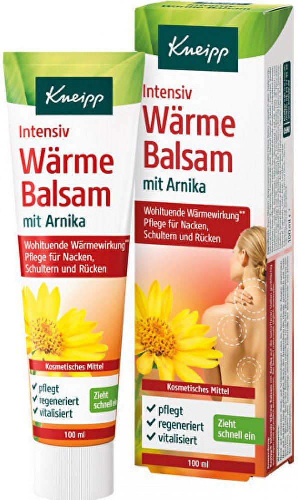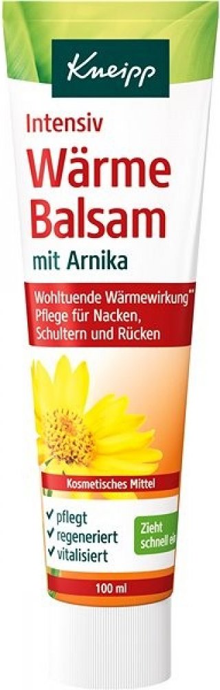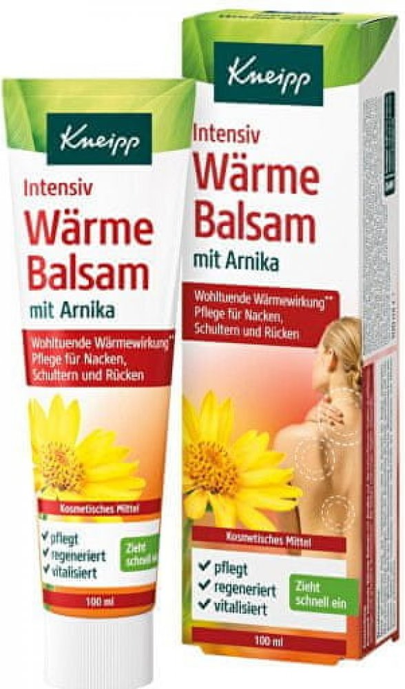 Balzám na svaly a klouby. Hřejivý tělový balzám Kneipp přináší příjemné teplo pro celé vaše tělo. Kneipp balzám na svaly a klouby. Hřejivý balzám s arnikou.Vlastnosti výrobku: Účinné látky rostlinného původu. Šetrnost k pokožce potvrzena dermatology univerzitní kliniky. Bez konzervantů způsobujících např. alergie. Bez parafínů, silikonů a minerálních olejů mající negativní vliv na životní prostředí. Vyvinuto vědci v oboru přírodních věd.Aplikace: Hřejivý tělový balzám Kneipp přináší příjemné teplo pro celé vaše tělo. Pocit prohřátí jde ruku v ruce s uvolněním svalů. Balzám je nepřekonatelný při masážích krku, zad nebo šíje. Vaše unavené svaly jej rovněž ocení po zvýšené námaze, kdy jim nabídne úlevnou relaxaci. Intenzivní masáží dojde k uvolnění svalů a k jejich následné reaktivaci.Baleno: 100 ml v tubě