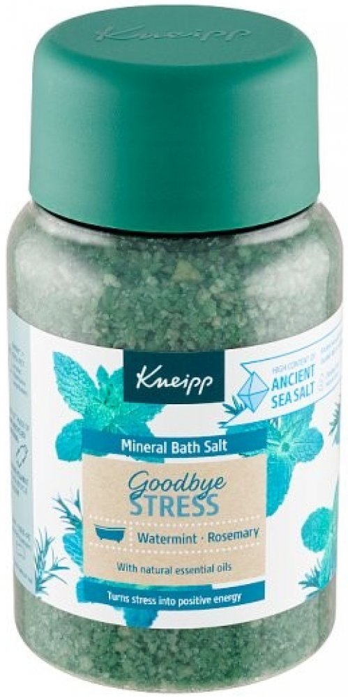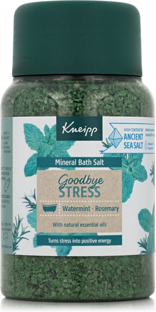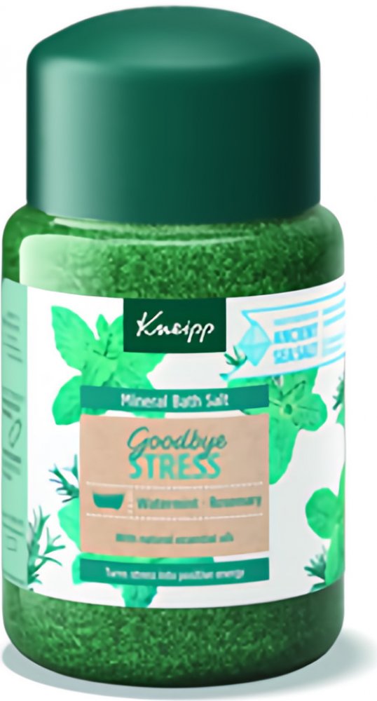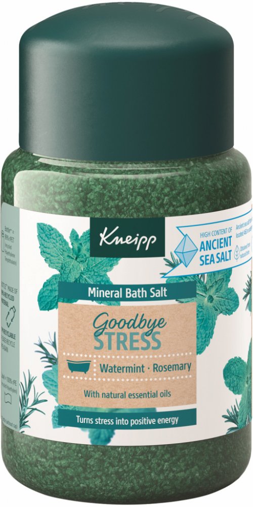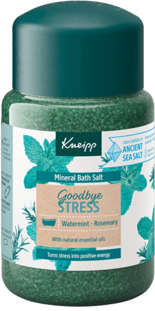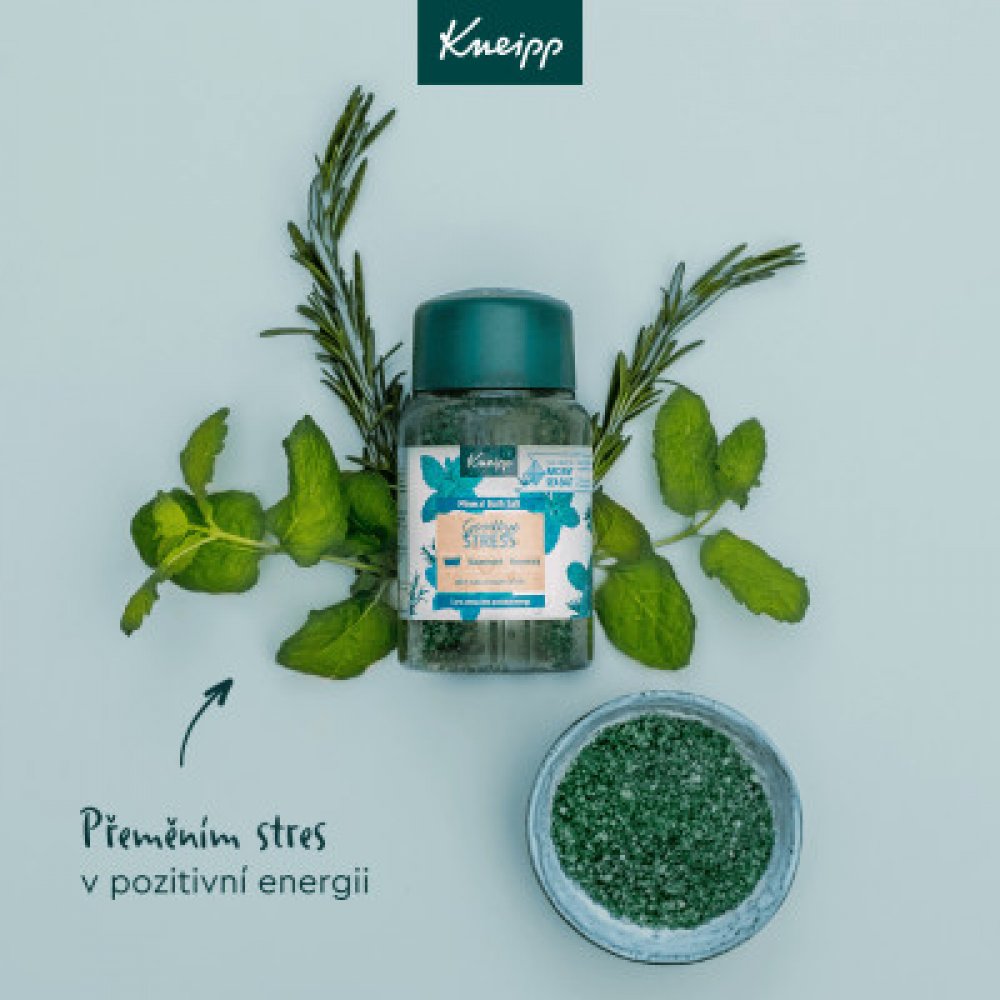 Sůl do koupele Kneipp z řady Goodbye Stress vytvořena pro přeměnu stresu v pozitivní energii. Rozmarýn a máta ji dodávají nádhernou uklidňující vůni, která prokazatelně zmírňuje stres a navozuje pozitivní energii.
