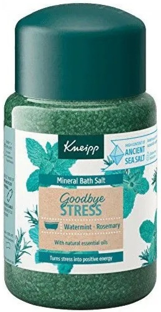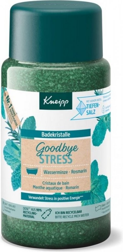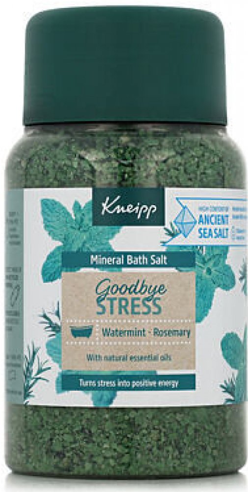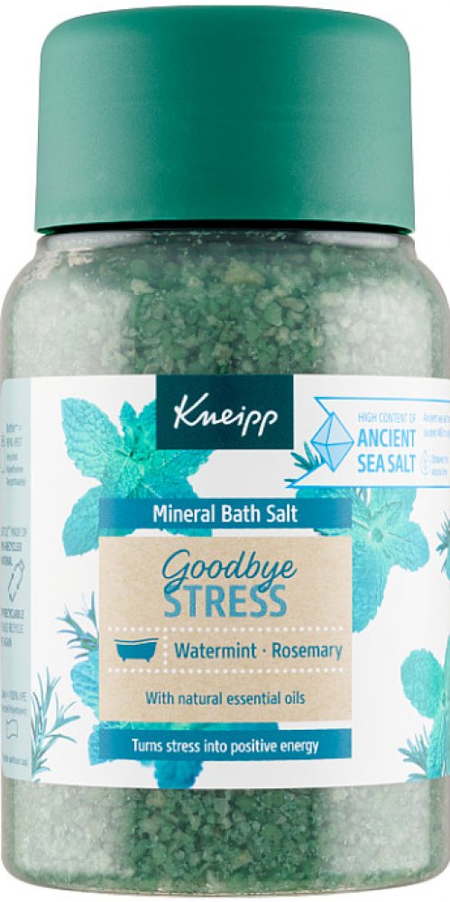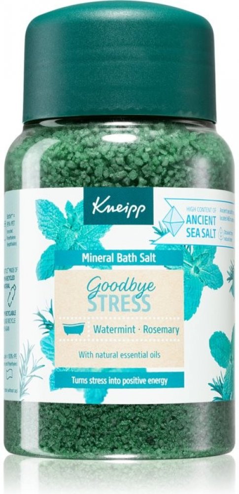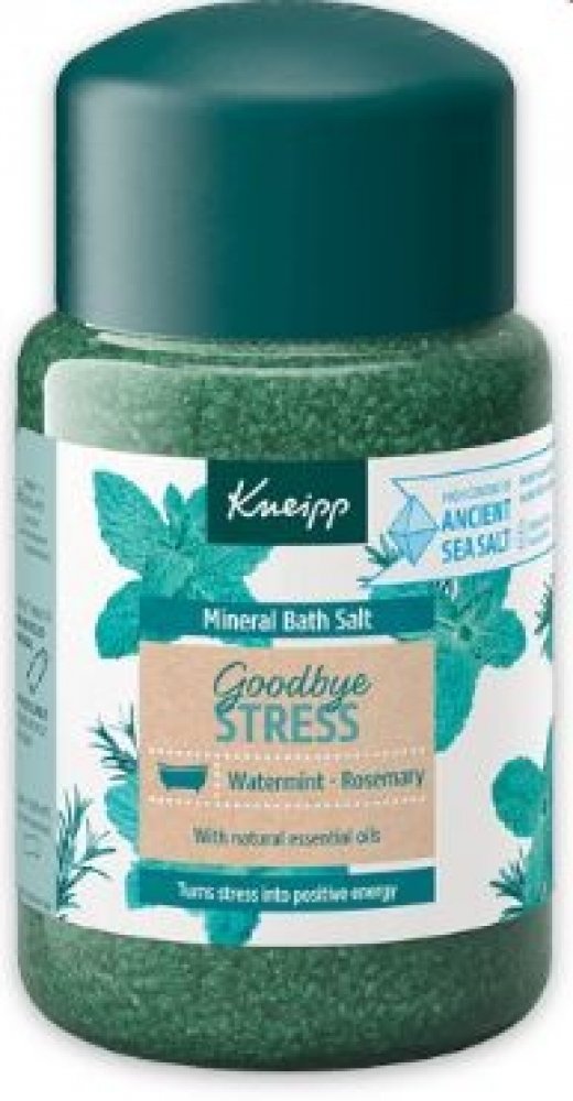 Sůl do koupele Kneipp z řady Goodbye Stress vytvořena pro přeměnu stresu v pozitivní energii. Rozmarýn a máta ji dodávají nádhernou uklidňující vůni, která prokazatelně zmírňuje stres a navozuje pozitivní energii.