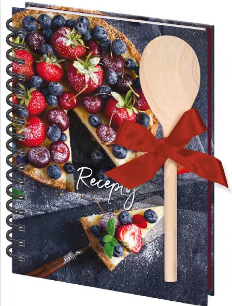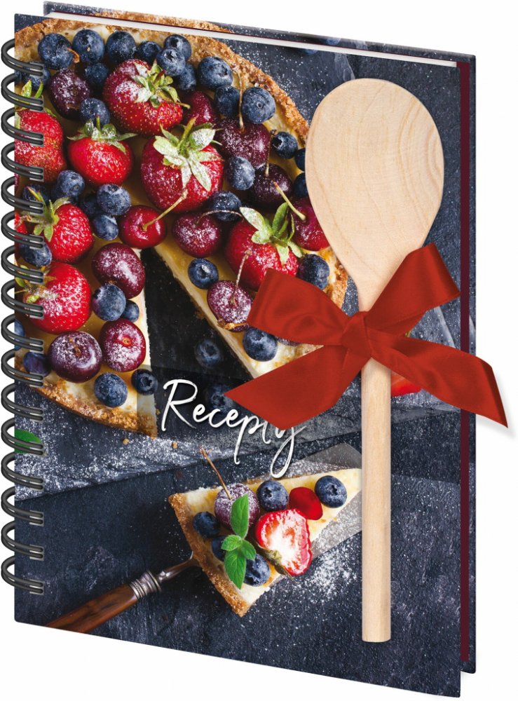 Nová kniha na recepty s vařečkou obsahuje úplně nové zpracování vnitřních listů. Stránky jsou linkované bez popisků. Každých 8 listů je rozděleno papírovým rozdělovníkem, který je možno si popsat druhem receptu. Kniha na recepty obsahuje celkem 10 rozdělovníků. Kniha s boční dvojitou spirálou a velmi kvalitním pevnými deskami je perfektní jako dárek pro vášnivé kuchaře a kuchařky, které si chtějí uchovat svoje nejlepší recepty. Na úvodních deskách je mašlí připevněna vařečka, kterou lze používat při vaření, místo ní si pak můžete připevnit např. tužku na psaní receptů.Materiál: papír, dřevěná vařečka.