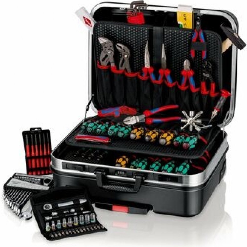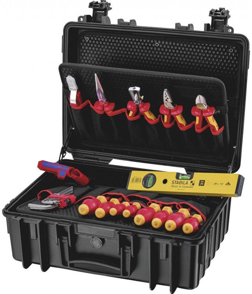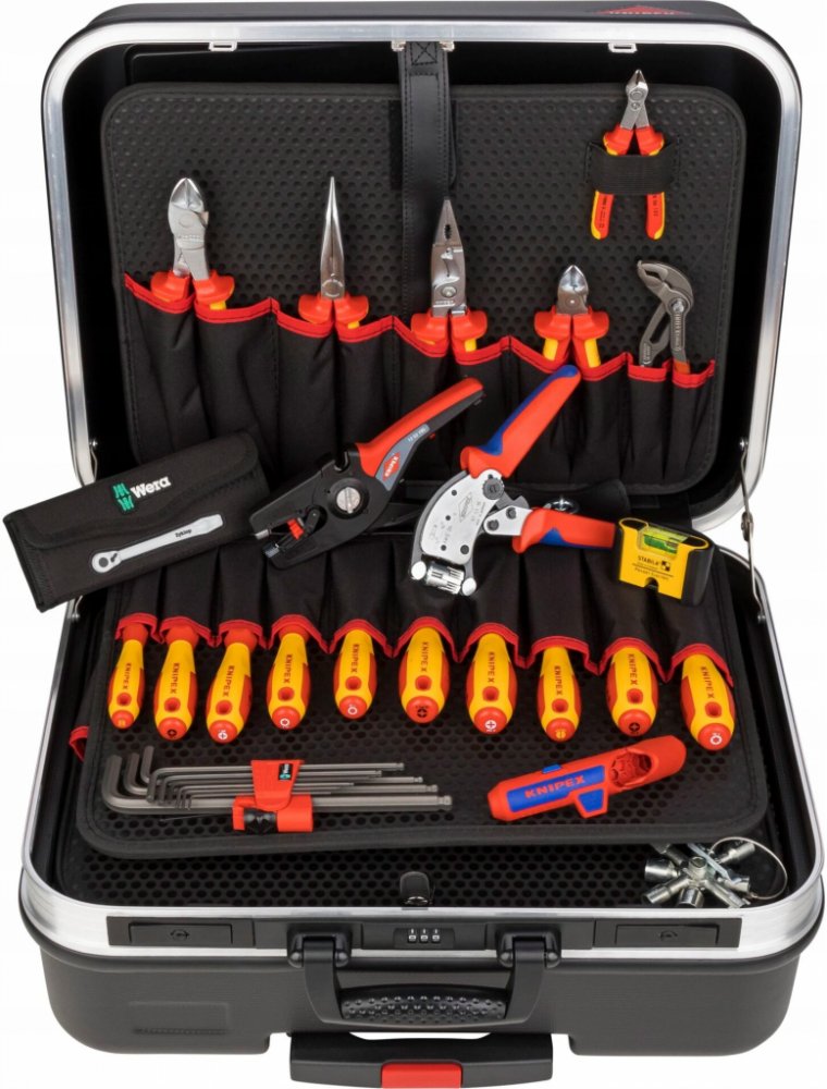 - Vybaveno 27 nástroji KNIPEX, celkem 68 značkovými nástroji, částečně testováno asociací VDE podle DIN EN 60900