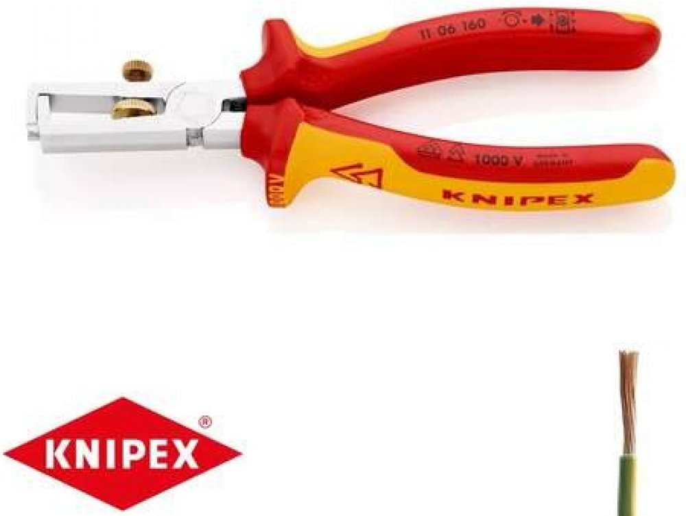 Odizolovací kleště 160 mm. KNIPEX 1106160Kleště s otevírací pružinou. Odizolovací kleště určené pro jednožilové vodiče, vícežilové vodiče, vodiče s jemnými dráty s umělohmotnou nebo gumovou izolací max. 5,0 mm nebo průřezem vodiče 10,0 mm2Jednoduché nastavení na požadovaný průměr drátu nebo vodiče s jemnými dráty pomocí šroubu s rýhovanou hlavou a kontramaticíMateriál kleští - speciální nástrojová ocel, kalená v oleji a popuštěnáTechnické údaje odizolovacích s otevírací pružinou 11 06 160: Délka rukojetí [mm]: 160 Hodnoty pro odizolování: Průměr [mm]: 5 Průřez vodiče [mm2]: 10,0 Průměr vodiče v jednotkách American Wire Gauge [AWG]: 7 Hmotnost [kg]: 0,165