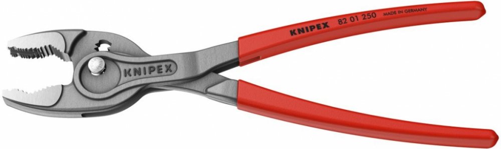 Úchopové kleště s posuvným kloubem KNIPEX 82 01 250 TwinGrip 250mmJedinečná kombinace: funkce předního a bočního úchopu, průvlečný kloub, seřízení pomocí tlačítka Velmi tenké kleště vám umožní pracovat i ve stísněných instalačních prostorách, s úzkou zónou k otáčení při dosahování rychlých výsledků Přední čelist s vysokým úchopem s robustními zuby a vysokým převodovým poměrem na špičce Velký přední a boční úchop pro průměry šířky plochého materiálu 5–27 mm Spolehlivý čelní úchop plochých prac...