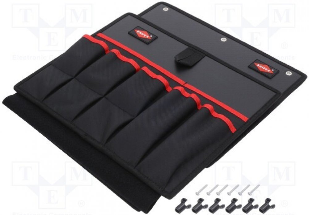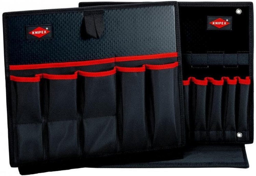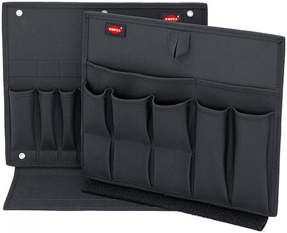 Přihrádka na nářadí prázdná KNIPEXDvoudílná přihrádka na nářadí prázdná KNIPEX je vyrobena z odolné polyesterové tkaniny. Přihrádky se dají vzájemně spojit suchým zipem. Obsahují 17 kapes a 17 elastických poutek pro uložení nářadí. V případě potřeby může být spodní přihrádka odebrána z boxu na nářadí Knipex.Technické údaje:Rozměry vnější (š x v x h): 375 x 55 x 310 mmHmotnost: 935 g