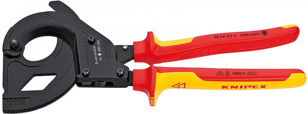 Kleště na kabely 315 mm s izolovanými kabely KNIPEX stříhají kabely armované ocelovými dráty až do průměru 45 mm/380 mm (např. 4 x 95 mm) v jednoručním a obouručním režimu. Jsou robustní, praktické a stabilní. Díky nízké hmotnosti (800 g) se s nimi snadno manipuluje a kvůli kompaktní konstrukci (délka 315 mm) je můžeme použít i ve stísněných prostorech. Výhodou je inovativní troj-rychlostní ráčnový pohon a opěrná plocha pro možnost opření při řezu. Jsou nevhodné pro stříhání kabelů ACSR a drátěných lan. Jsou vyrobeny ze speciální nástrojové oceli ve zvláštní jakosti, kované a kalené v oleji.