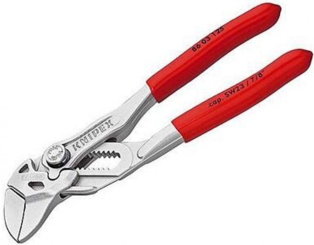 Kleště nahrazující sadu klíčů na šrouby, metrické i palcové Hladké čelisti v případě potřeby uchopí se silným přítlakem všechny rovnoběžné plochy v rozsahu úchopu a otevírají téměř neomezené možnosti použití těchto kleští např. pro šroubení s pojistnou maticí, slisování pro aktivace kontaktních lepidel, štípání dlaždic při obkladačských pracích, uvolňování kabelových spon, využití jako malý svěrák hladké čelisti pro šetrnou montáž povrchově zušlechtěných armatur - práce přímo na chromu! nastavitelný nástroj pro utahování šroubů výborně se hodí k uchopování, držení, stlačování a ohýbání obrobků žádné poškození hran u choulostivých armatur díky celoplošné opoře bez vůle nastavení stisknutím tlačítka přímo na obrobku plynulé nastavení všech velikostí klíčů až do uvedené kapacity pomocí paralelně vedených čelistí spolehlivé zaskočení čepu kloubu: žádné neúmyslné přenastavení zdvih mezi čelistmi umožňuje rychlé utahování a povolování šroubových spojů na principu rohatky se západkou velmi silné sevření díky 10násobnému zesílení síly ruky chromvanadová elektroocel, kovaná, kalená v oleji Kleště: poniklováno Rukojeti: potaženo plastem Průměr šestihranu: 7/8 palce Průměr šestihranu: 23 mm Počet nastavitelných pozic: 11 Délka: 125 mm Hmotnost: 105 g Úchopné plošky hladké Prosazený kloub