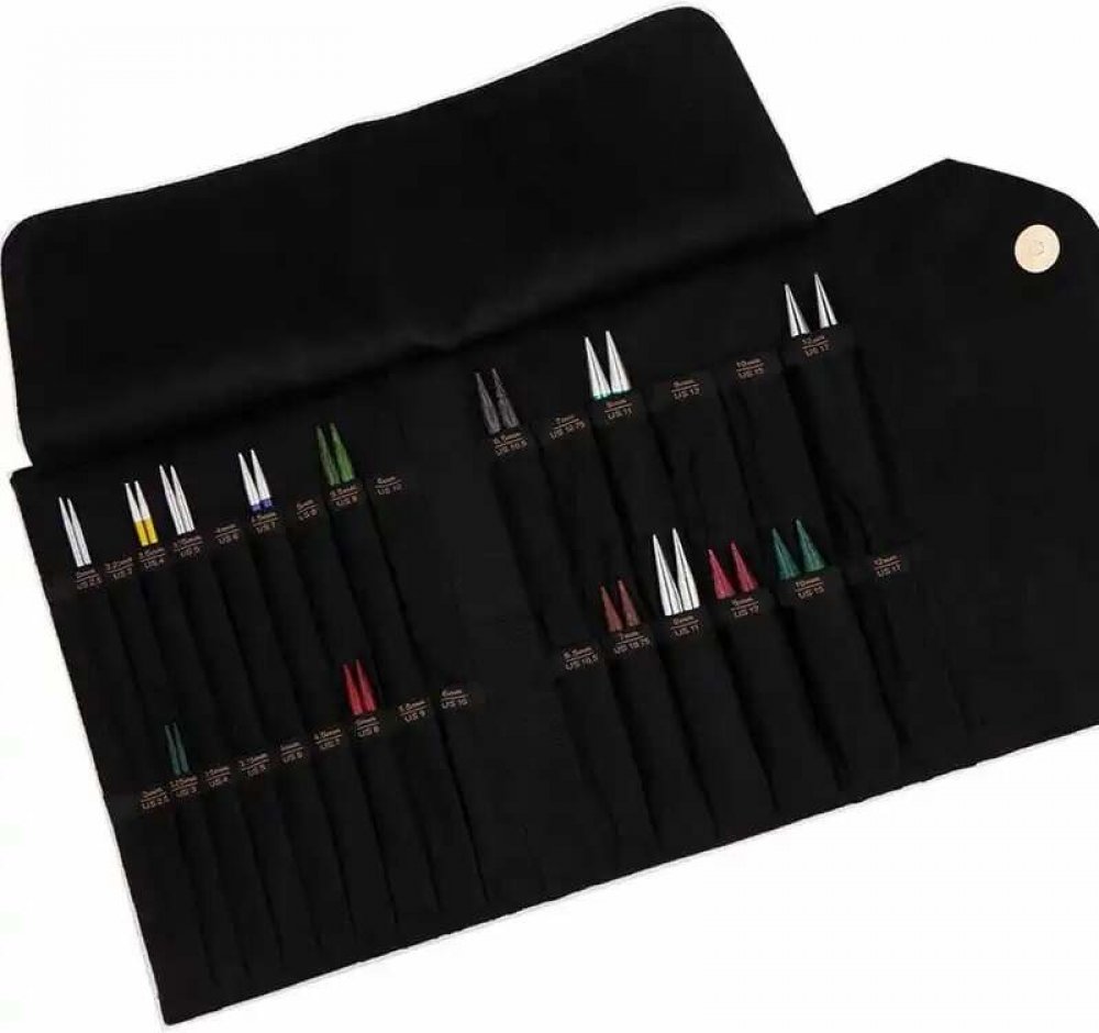 Semišové pouzdro Coal má 30 přihrádek na výměnné jehlice, které jsou označeny velikostmi a kapsu na lanka a příslušenství.