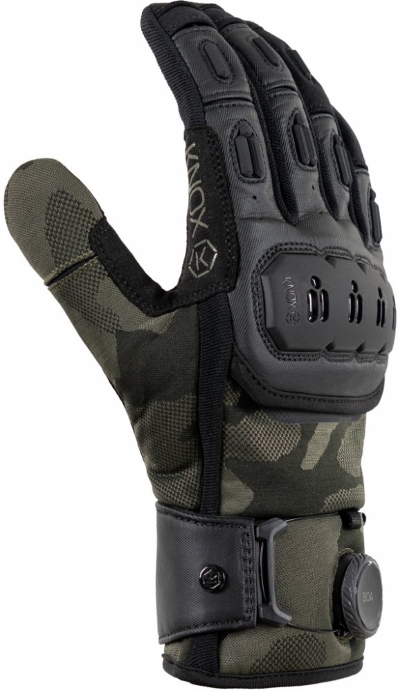 Jednovrstvý Clarino prodyšný materiál na dlani Překryvná podložka Amara na dlani Plastový plovoucí chránič Knox Micro-Lock pro vynikající pohodlí při jízdě Pod plovoucím chráničem se nachází stylový tmavý reflexní potisk. Potisk se na světle odráží Lisovaný TPR chrániče na prstech pro extra odolnost proti oděru Patentovaný Knox Impact Scaphoid Protection System (SPS) s Micro-Lock na dlani (patent č. EP1594378) Unikátní systém zapínání Boa fit Bezešvá konstrukce konce prstů Ovládání dotykové obrazovky Schváleno CE