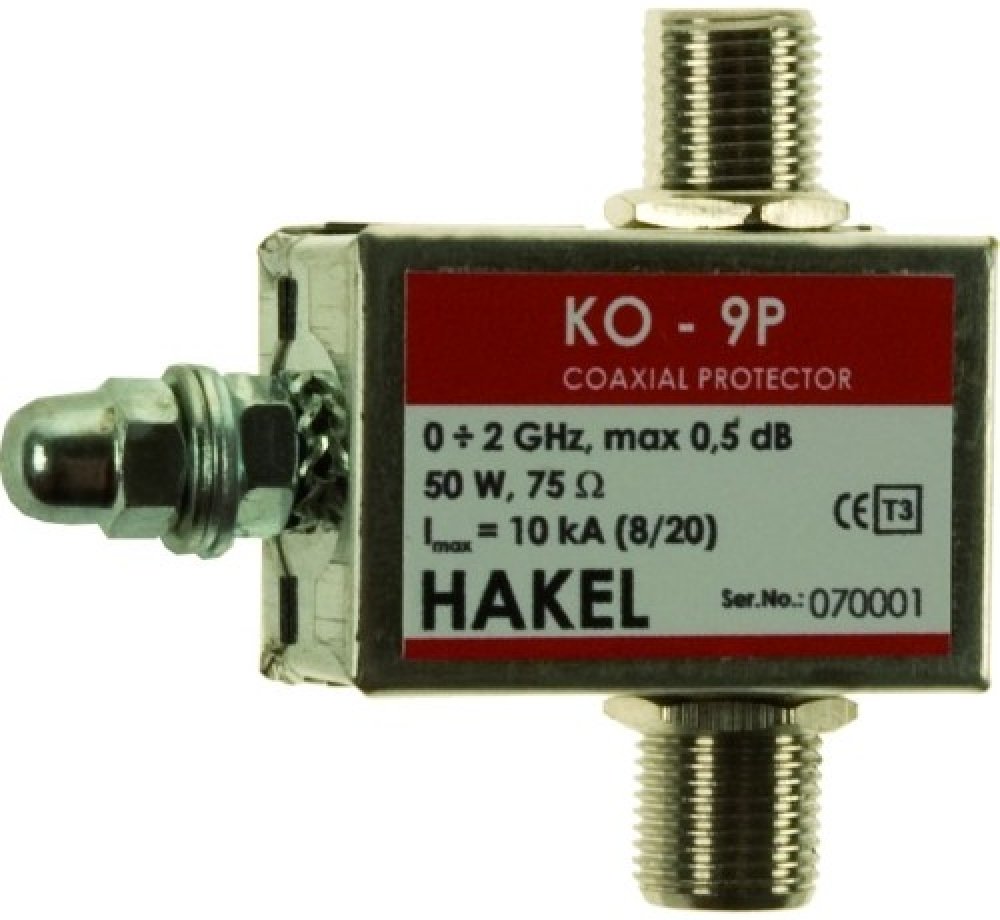 Koaxiální přepěťová ochrana KO-9P je určena k ochraně zařízení propojených s anténním systémem pomocí koaxiálních kabelů. Použitím s peciálních bleskojistek s maximálním výbojových proudem Imax(8/20) = 10 kA je zajištěna spolehlivá ochrana přijímacích a vysílacích systémů i proti účinkům blízkého úderu blesku. Pro použití v různých aplikacích nabízí firma Hakel široký sortiment koaxiálních ochran pro různé typy konektorů a pro odstupňované výkony. Doporučuje se pro použití na rozhraní ochranných zón LPZ 0A(B)-1 a výše podle ČSN EN 62305 ed. 2.