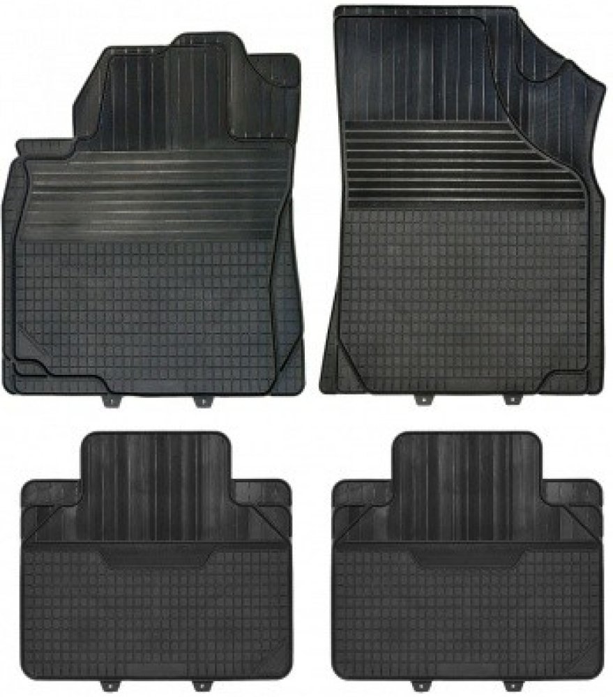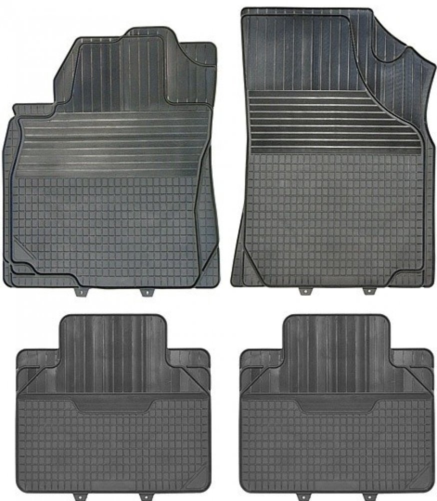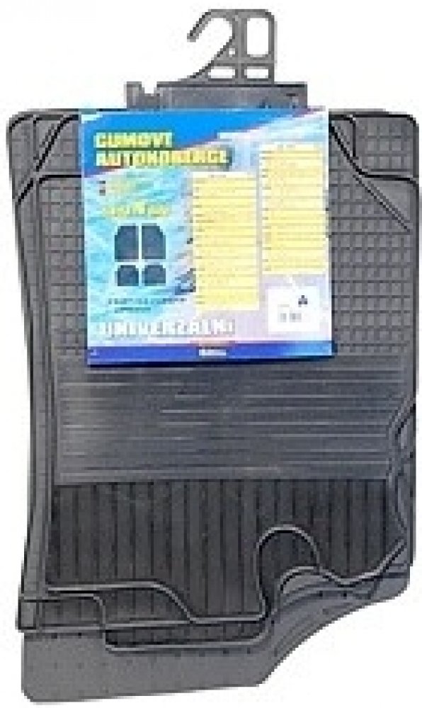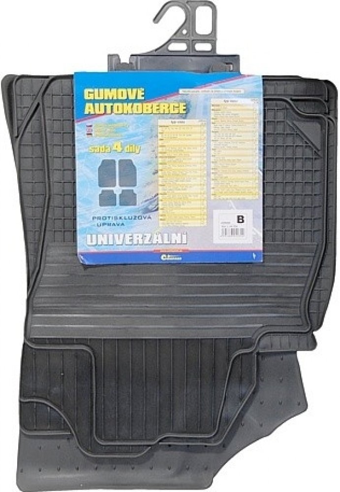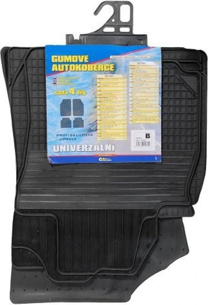 Sada univerzálních gumových koberců do automobilu, s protiskluzovou úpravou. Univerzální velikost pro většinu běžných vozů. Balení obsahuje koberec na stranu řidiče, koberec na stranu spolujezdce a dva koberce před zadní sedadla. Materiál guma, barva černá.