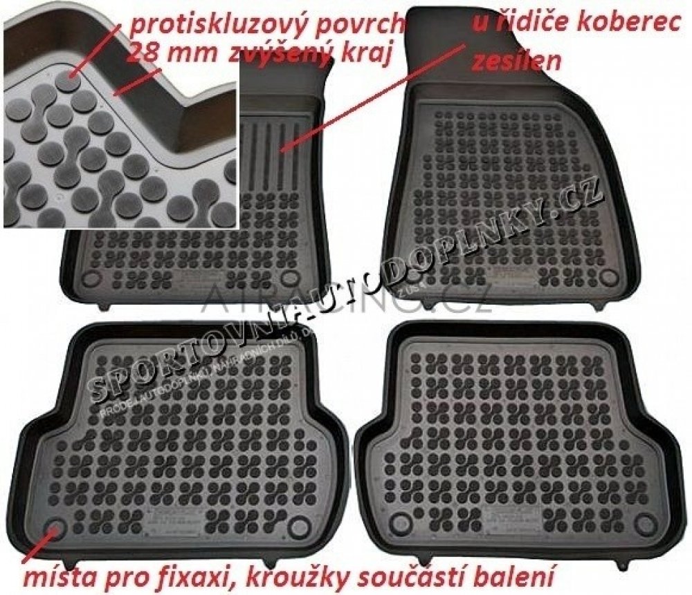 Gumové koberce chrání prostor podlahy v interiéru auta před znečištěním. Zvýšený okraj slouží pro zachytávání nečistot a tekutin. Koberce jsou dodávané s fixačními prvky pro uchycení koberců proti sklouzávání.