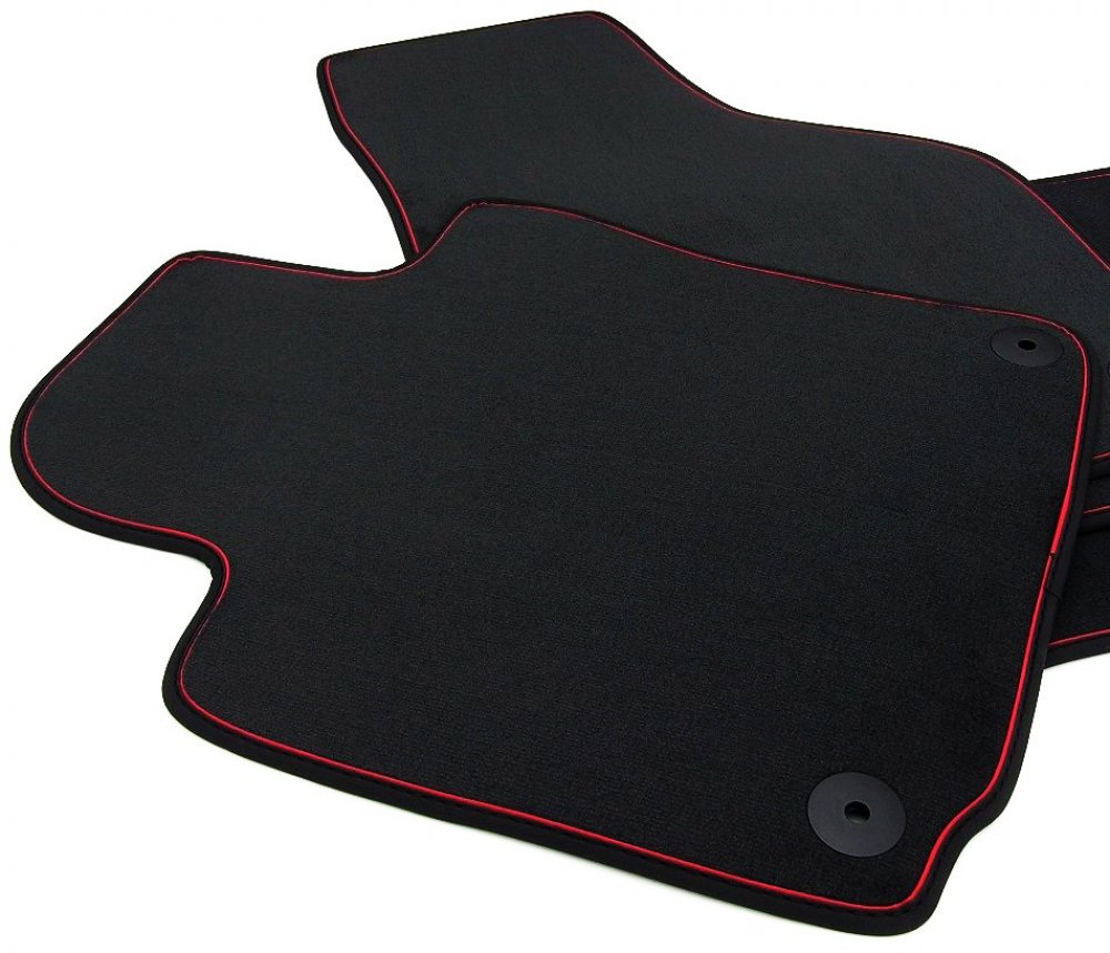 Přesné luxusní textilní auto koberce RED LINE obšity červenou koženkou vyráběné na zakázku specializovanou českou firmou.