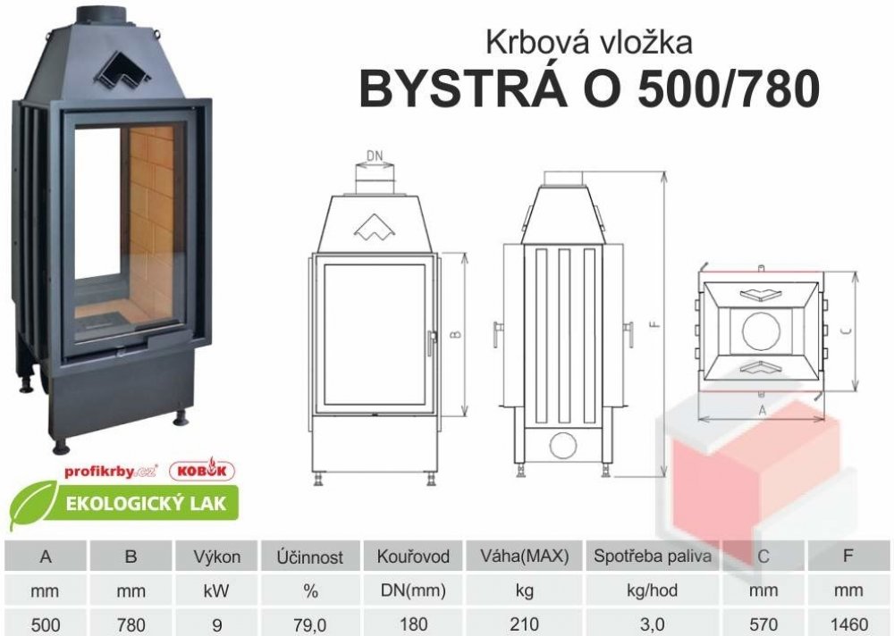 Krbová vložka KOBOK BYSTRÁ O 500 780 - oboustranná, portál 500x780 mm, průměrný výkon 9kW, účinnost 79%, kouřovod 180mm, použití pro sálavé, akumulační a teplovzdušné stavby, výroba:Kobok. servis:Profikrby