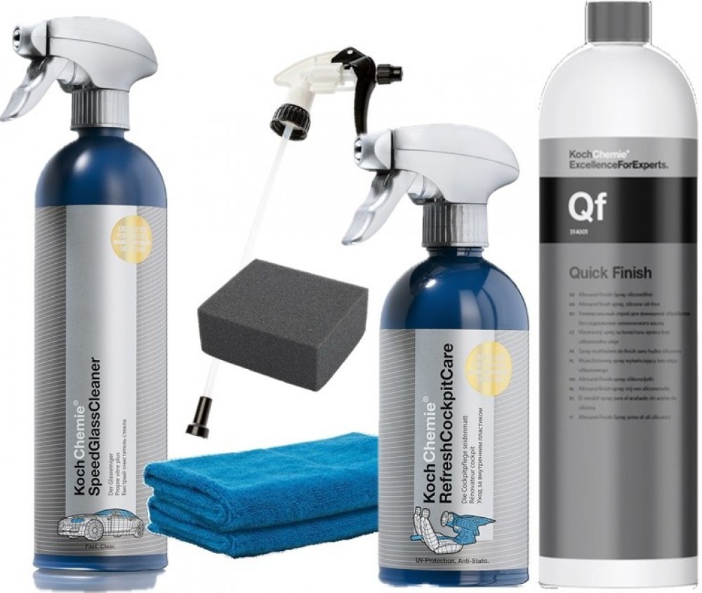 Sada obsahuje několik pečlivě vybraných produktů, které se vzájemně doplňují a zajišťují komplexní péči o interiér vozidla. Quick Finish je multifunkční detailer, který čistí a chrání lakované povrchy, umělé hmoty, kokpity a displeje. Jeho složení bez silikonu zajišťuje vysoký lesk a hladkost bez šmouh. Speedglasscleaner s rozprašovačem je ideální pro rychlé a efektivní čištění skel a lakovaných povrchů, přičemž zanechává příjemnou vůni.