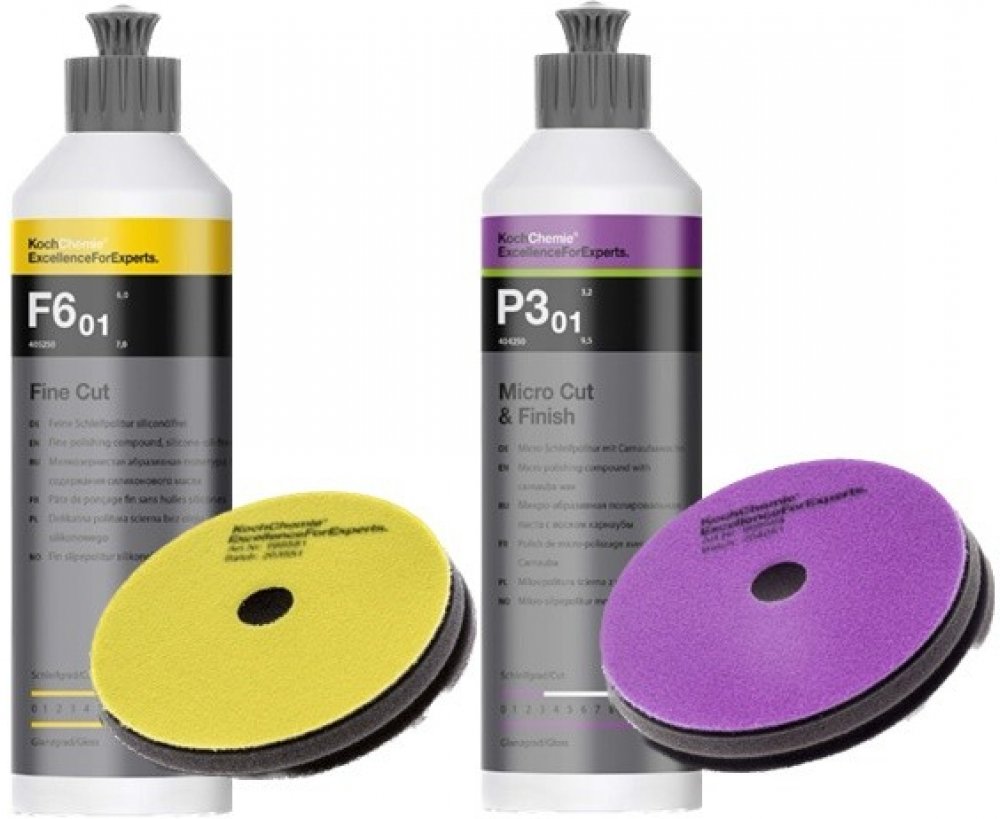 Mikro-brusná leštící pasta Koch Micro Cut & Finish P3.01 250 ml: mikro-brusná leštící pasta s karnaubským voskem. Nejmodernější, finální, leštící, antihologramní pasta s vysokým leskem. Je určena pro strojové leštění na odstranění stop po leštění, hologramech a jemných škrábanců a ostrých částí až do zrnitosti brusného papíru o velikosti 3 000. Stupeň brusu 3,2; Stupeň lesku 9,5