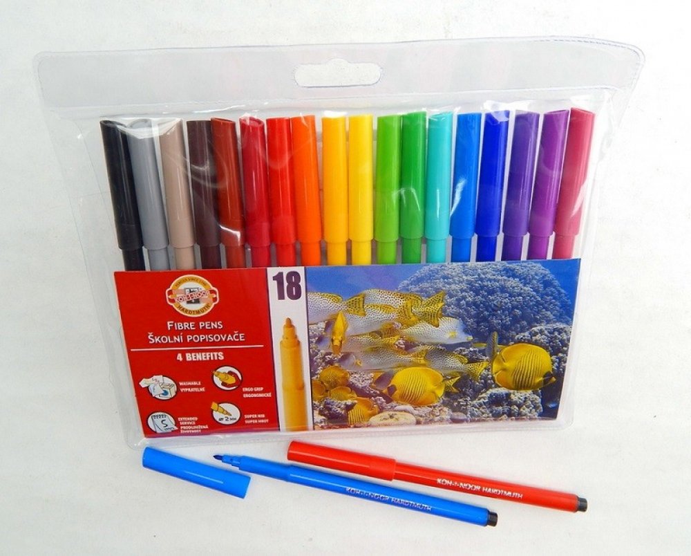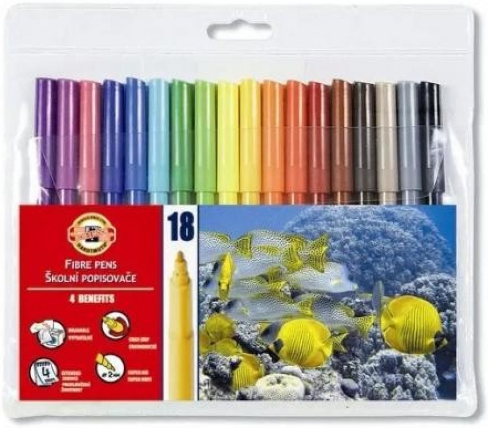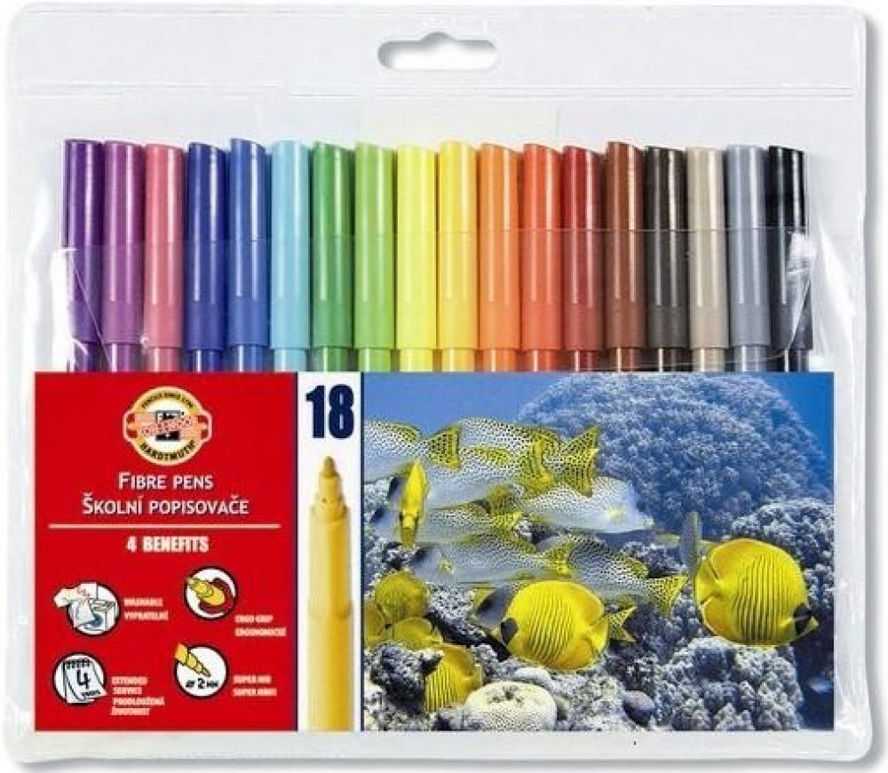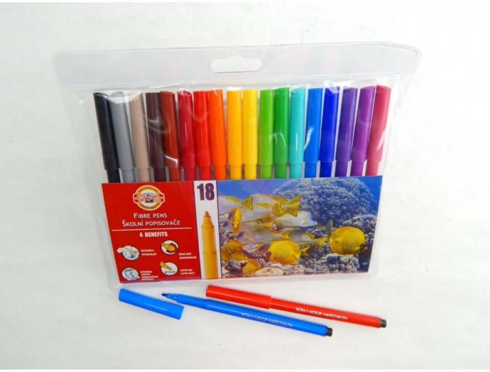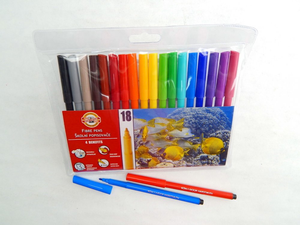 Balení obsahuje 18 ks barevných fixů v plastovém pouzdře.