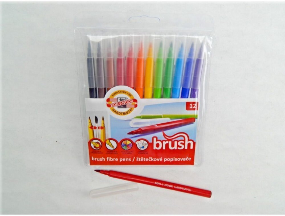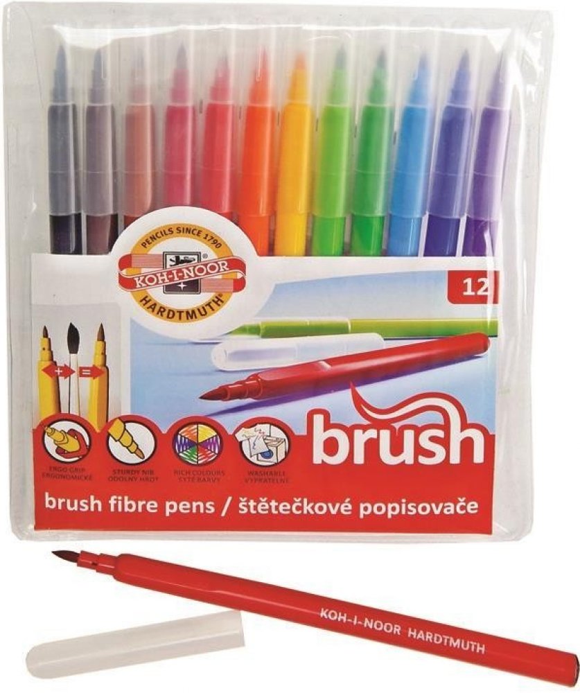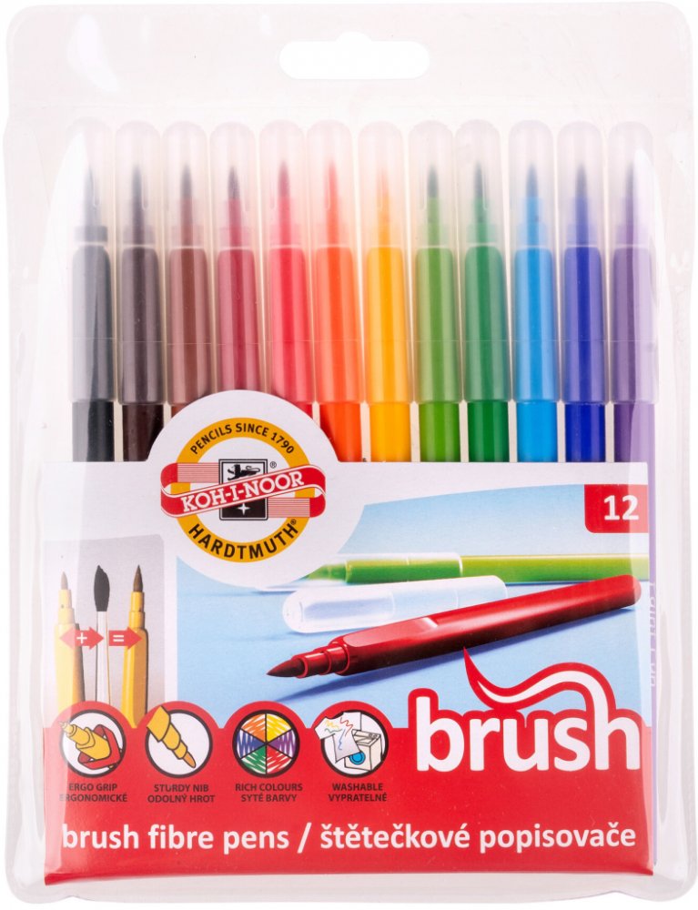 Souprava popisovačů s válcovým štětcovým hrotem, trojhranný ergonomický úchop, ventilační bezpečnostní chránítko, které umožňuje dýchání i v případě spolknutí, pestrý vypratelný inkoust, odolnost proti vyschnutí minimálně 3 roky, umožňují psát a malovat jako štětcem,, šířka stopy 1-3 mm, 12 barevných odstínů.